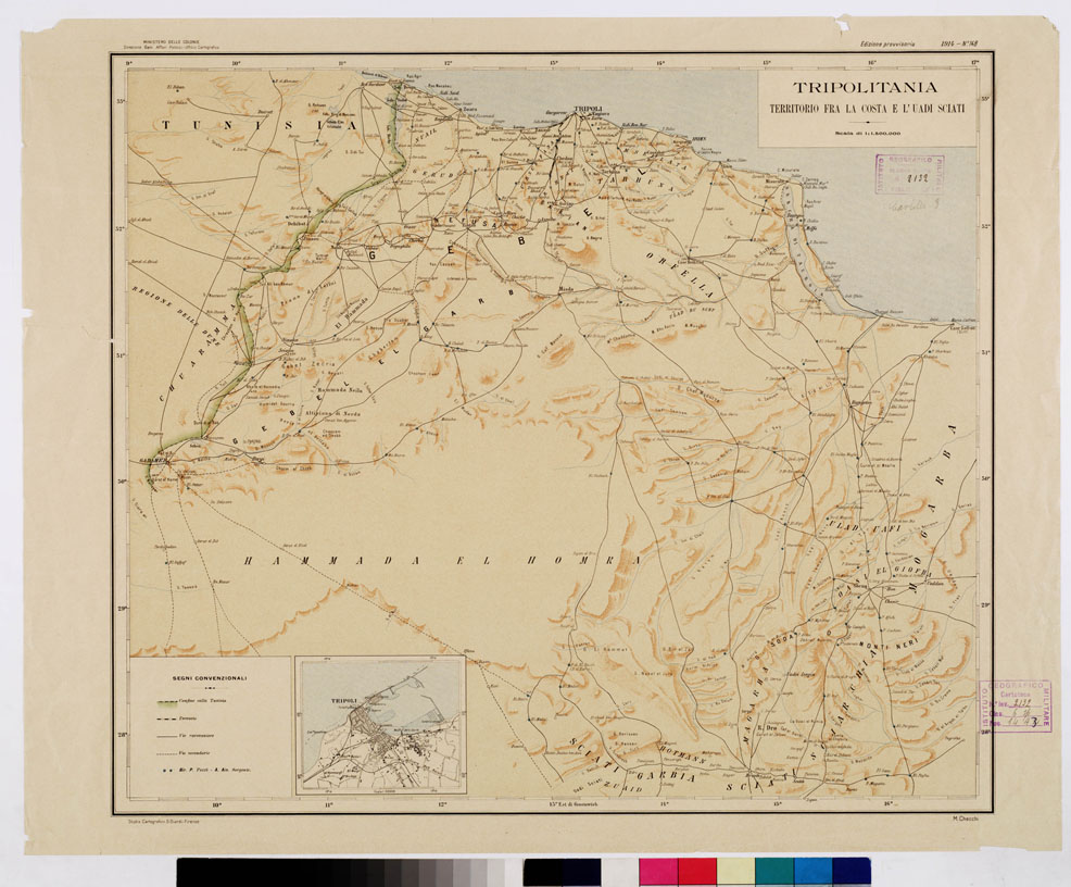 "MINISTERO DELLE COLONIE. DIREZIONE GENERALE AFFARI POLITICI. UFFICIO CARTOGRAFICO. STUDIO CARTOGRAFICO G. GIARDI. FIRENZE. Un foglio a colori. Il terreno è rappresentato a fondo unito giallino con orografia dimostrata a mezzo di tratteggio in bistro le acque sono colorate in azzurro. Ferrovie, carovaniere e vie secondarie sono in nero. Compilazione di M. Checchi. In basso una cartina di Tripoli e dintorni al 500.000 e la leggenda dei segni convenzionali."