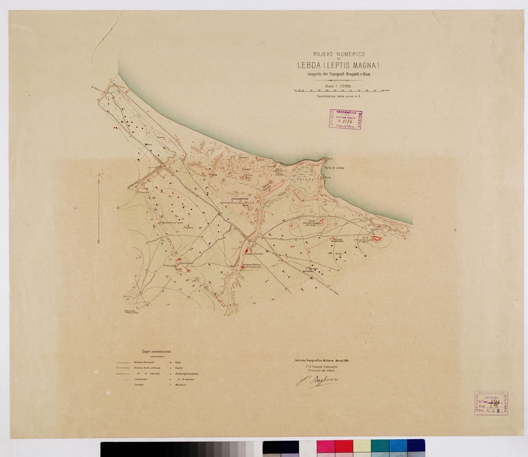 "I.G.M. Rilevamento del territorio dell'antica Leptis Magna eseguito dall'I.G.M. dietro richiesta dell'Ufficio Archeologico di Tripoli. Le operazioni eseguite col metodo celerimetrico furono condotte dai topografi Grupelli e Giua sotto la direzione del T. Col. Baglione. Le curve sono all'equidistanza di 5 metri. Stampa in cromo a cinque colori."