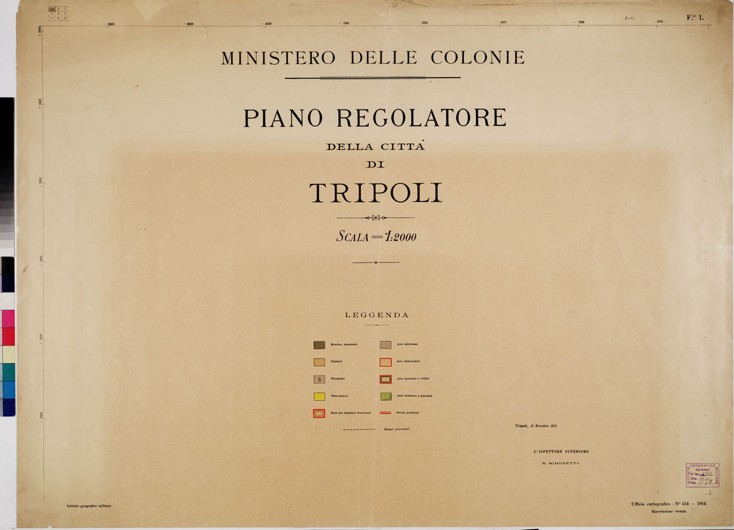 "MINISTERO DELLE COLONIE. II piano consta di 9 fogli, oltre il titolo, riprodotti in cromo. Il lavoro fu eseguito per conto dell'Ufficio Corpo R. Genio Civile in vista dello sviluppo di opere pubbliche stradali, edilizie, condutture d'acqua, ecc., e per completare il progetto di un piano regolatore. Il piano fu dapprima studiato sopra una carta alla scala di 1:20.000 tratta dalla riduzione di un'antica carta al 10.000 costruita da ingegneri francesi, assai imprecisa. Il Genio Civile ricorse perciò all'I.G.M. per ottenere un rilievo a cui poggiare con sicurezza il piano regolatore. Il lavoro della costruzione della pianta procedette così sotto la direzione e il controllo del personale dell'I.G.M. e fu compiuto dal 1 luglio al 4 novembre 1912. Per la costruzione della pianta fu fissata una proiezione ortografica (o Pianta naturale) sul piano tangente alla superficie media del mare nel punto trigonometrico stabilito sul Castello assunto come centro di sviluppo e per l'orientamento l'azimut astronomico misurato dalla batteria del Faro trasportandolo geodeticamente al centro sopradetto. Le curve di livello per la rappresentazione orografica del terreno sono all'equidistanza di cinque metri con curve intermedie punteggiate. Su ciascun foglio sono indicate a mezzo di vari colori le aree destinate alla demolizione, quelle dei nuovi fabbricati e giardini è dimostrata inoltre la sistemazione e costruzione del nuovo porto. Del piano fu tirata una riduzione in un sol foglio (cm. 72 x 102) a colori alla scala di 1:5.000 (N. 2149 d' inv.). "
