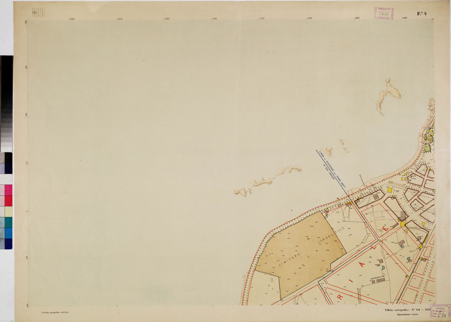 "MINISTERO DELLE COLONIE. II piano consta di 9 fogli, oltre il titolo, riprodotti in cromo. Il lavoro fu eseguito per conto dell'Ufficio Corpo R. Genio Civile in vista dello sviluppo di opere pubbliche stradali, edilizie, condutture d'acqua, ecc., e per completare il progetto di un piano regolatore. Il piano fu dapprima studiato sopra una carta alla scala di 1:20.000 tratta dalla riduzione di un'antica carta al 10.000 costruita da ingegneri francesi, assai imprecisa. Il Genio Civile ricorse perciò all'I.G.M. per ottenere un rilievo a cui poggiare con sicurezza il piano regolatore. Il lavoro della costruzione della pianta procedette così sotto la direzione e il controllo del personale dell'I.G.M. e fu compiuto dal 1 luglio al 4 novembre 1912. Per la costruzione della pianta fu fissata una proiezione ortografica (o Pianta naturale) sul piano tangente alla superficie media del mare nel punto trigonometrico stabilito sul Castello assunto come centro di sviluppo e per l'orientamento l'azimut astronomico misurato dalla batteria del Faro trasportandolo geodeticamente al centro sopradetto. Le curve di livello per la rappresentazione orografica del terreno sono all'equidistanza di cinque metri con curve intermedie punteggiate. Su ciascun foglio sono indicate a mezzo di vari colori le aree destinate alla demolizione, quelle dei nuovi fabbricati e giardini è dimostrata inoltre la sistemazione e costruzione del nuovo porto. Del piano fu tirata una riduzione in un sol foglio (cm. 72 x 102) a colori alla scala di 1:5.000 (N. 2149 d' inv.). "