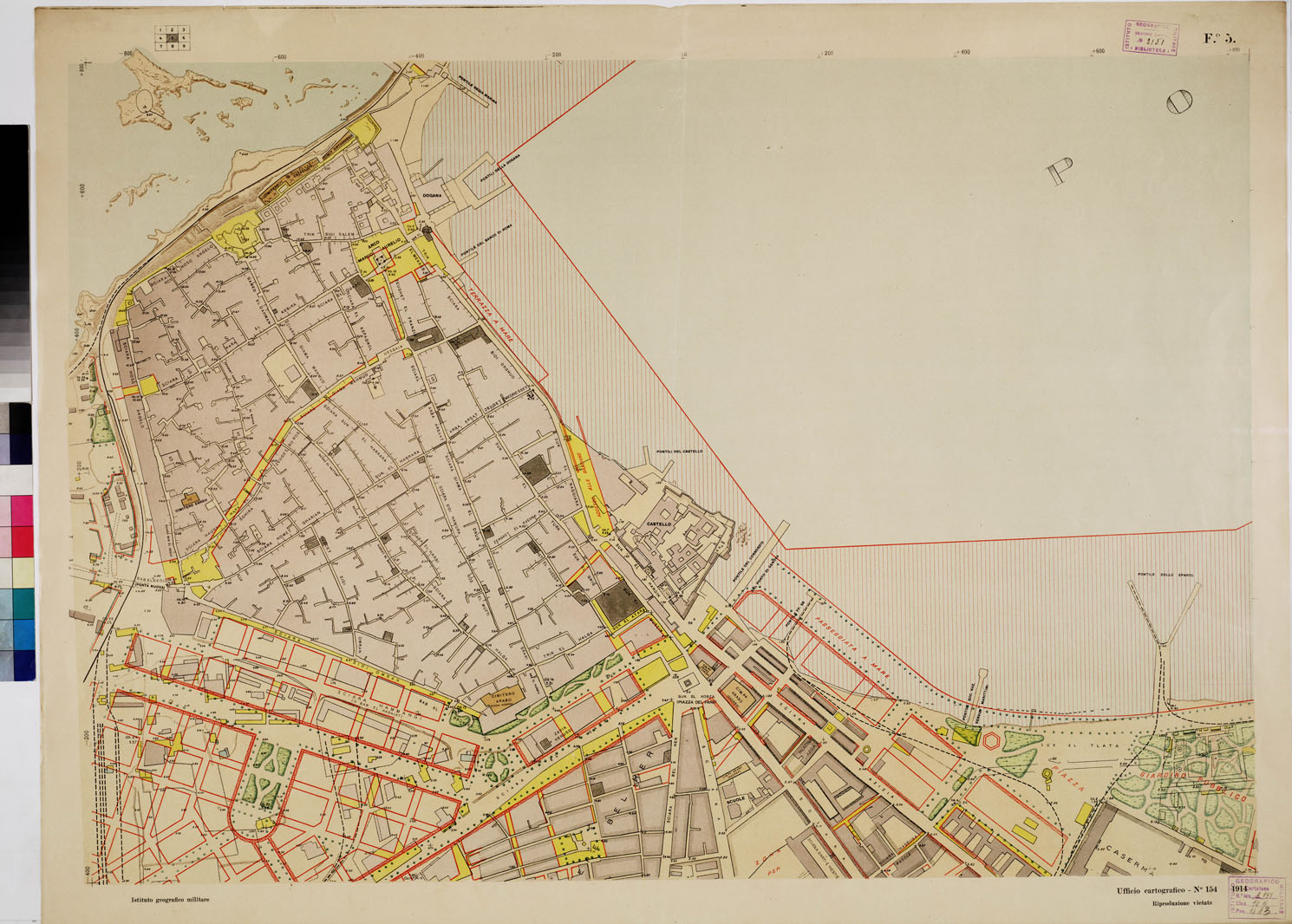 "MINISTERO DELLE COLONIE. II piano consta di 9 fogli, oltre il titolo, riprodotti in cromo. Il lavoro fu eseguito per conto dell'Ufficio Corpo R. Genio Civile in vista dello sviluppo di opere pubbliche stradali, edilizie, condutture d'acqua, ecc., e per completare il progetto di un piano regolatore. Il piano fu dapprima studiato sopra una carta alla scala di 1:20.000 tratta dalla riduzione di un'antica carta al 10.000 costruita da ingegneri francesi, assai imprecisa. Il Genio Civile ricorse perciò all'I.G.M. per ottenere un rilievo a cui poggiare con sicurezza il piano regolatore. Il lavoro della costruzione della pianta procedette così sotto la direzione e il controllo del personale dell'I.G.M. e fu compiuto dal 1 luglio al 4 novembre 1912. Per la costruzione della pianta fu fissata una proiezione ortografica (o Pianta naturale) sul piano tangente alla superficie media del mare nel punto trigonometrico stabilito sul Castello assunto come centro di sviluppo e per l'orientamento l'azimut astronomico misurato dalla batteria del Faro trasportandolo geodeticamente al centro sopradetto. Le curve di livello per la rappresentazione orografica del terreno sono all'equidistanza di cinque metri con curve intermedie punteggiate. Su ciascun foglio sono indicate a mezzo di vari colori le aree destinate alla demolizione, quelle dei nuovi fabbricati e giardini è dimostrata inoltre la sistemazione e costruzione del nuovo porto. Del piano fu tirata una riduzione in un sol foglio (cm. 72 x 102) a colori alla scala di 1:5.000 (N. 2149 d' inv.). "