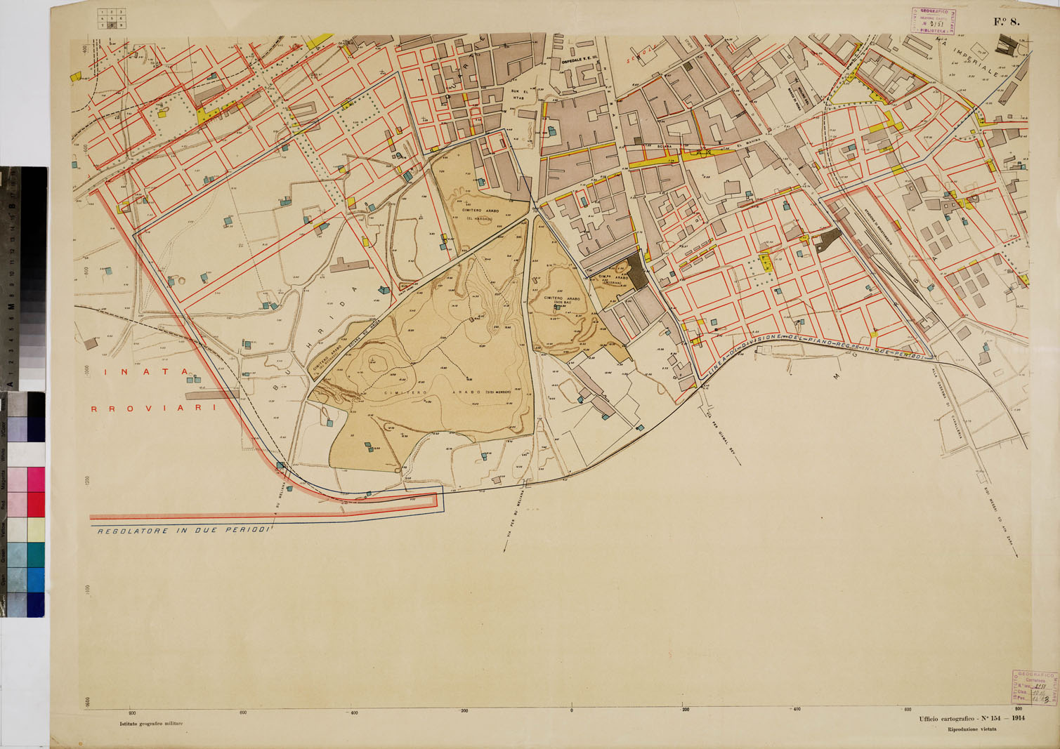 "MINISTERO DELLE COLONIE. II piano consta di 9 fogli, oltre il titolo, riprodotti in cromo. Il lavoro fu eseguito per conto dell'Ufficio Corpo R. Genio Civile in vista dello sviluppo di opere pubbliche stradali, edilizie, condutture d'acqua, ecc., e per completare il progetto di un piano regolatore. Il piano fu dapprima studiato sopra una carta alla scala di 1:20.000 tratta dalla riduzione di un'antica carta al 10.000 costruita da ingegneri francesi, assai imprecisa. Il Genio Civile ricorse perciò all'I.G.M. per ottenere un rilievo a cui poggiare con sicurezza il piano regolatore. Il lavoro della costruzione della pianta procedette così sotto la direzione e il controllo del personale dell'I.G.M. e fu compiuto dal 1 luglio al 4 novembre 1912. Per la costruzione della pianta fu fissata una proiezione ortografica (o Pianta naturale) sul piano tangente alla superficie media del mare nel punto trigonometrico stabilito sul Castello assunto come centro di sviluppo e per l'orientamento l'azimut astronomico misurato dalla batteria del Faro trasportandolo geodeticamente al centro sopradetto. Le curve di livello per la rappresentazione orografica del terreno sono all'equidistanza di cinque metri con curve intermedie punteggiate. Su ciascun foglio sono indicate a mezzo di vari colori le aree destinate alla demolizione, quelle dei nuovi fabbricati e giardini è dimostrata inoltre la sistemazione e costruzione del nuovo porto. Del piano fu tirata una riduzione in un sol foglio (cm. 72 x 102) a colori alla scala di 1:5.000 (N. 2149 d' inv.). "
