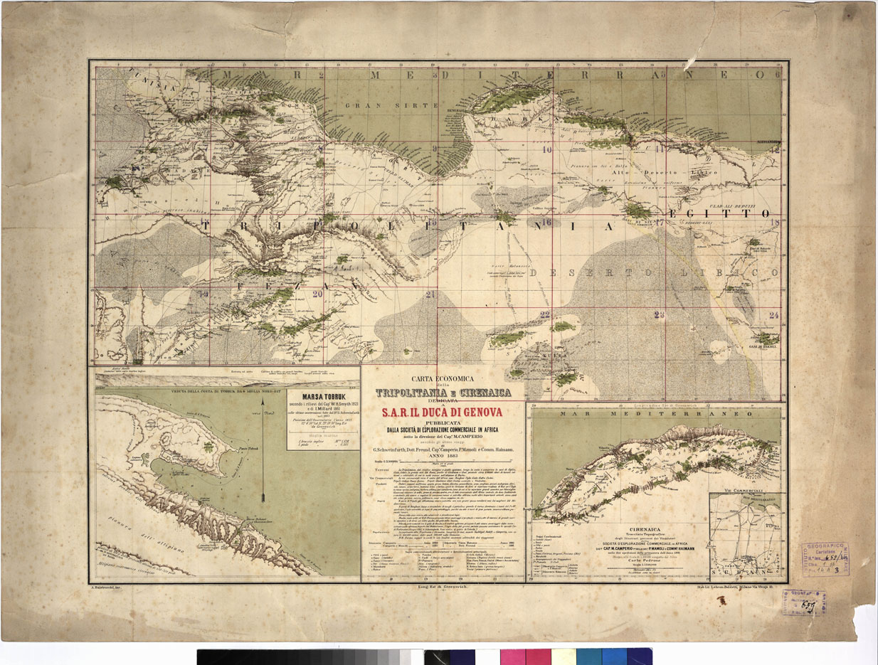 "DITTA EDITRICE ARTARIA DI FERD. SACCHI E FIGLI. MILANO. SOC. ESPL. IN AFRICA. La carta, dedicata a S. A. R. il Duca di Genova, fu pubblicata dalla Società di esplorazione commerciale in Africa sotto la direzione del Cap. M. Camperio sui dati dei viaggi di G. Schweinfurth, dott. Freund, Cap. Camperio, P. Mamoli e Comm. Haimann. Essa mostra i terreni coltivati e coltivabili, i limiti delle vegetazioni, le vie commerciali, ecc. Sono inoltre tracciati gli itinerari Camperio (1880), Camperio e Mamoli (1881), Haimann (1881), Freund (1881). Contiene una cartina parziale di Marsa Tobruk tratta dai rilievi inglesi del 1821 e una della Cirenaica (1:1.200.000) con tracciato topografico degli itinerari percorsi dai viaggiatori della Società d'esplorazione commerciale in Africa (Camperio, Mamoli, Haimann) nelle due spedizioni della primavera dell'anno 1881. Le longitudini si riferiscono al meridiano di Greenwich. Il foglio è piegato e contenuto in libretto. "