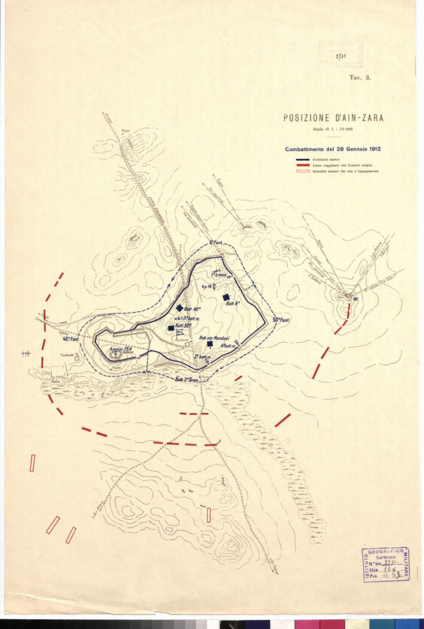 "Combattimento del 28 gennaio 1912. Scala 1:10.000. Dieci tavole a colori bistro per la planimetria e l'orografia (curve o tratteggio), azzurro per le acque, rosso per le indicazioni di carattere militare... dal 20-12-1911 AL 30-06-1912"