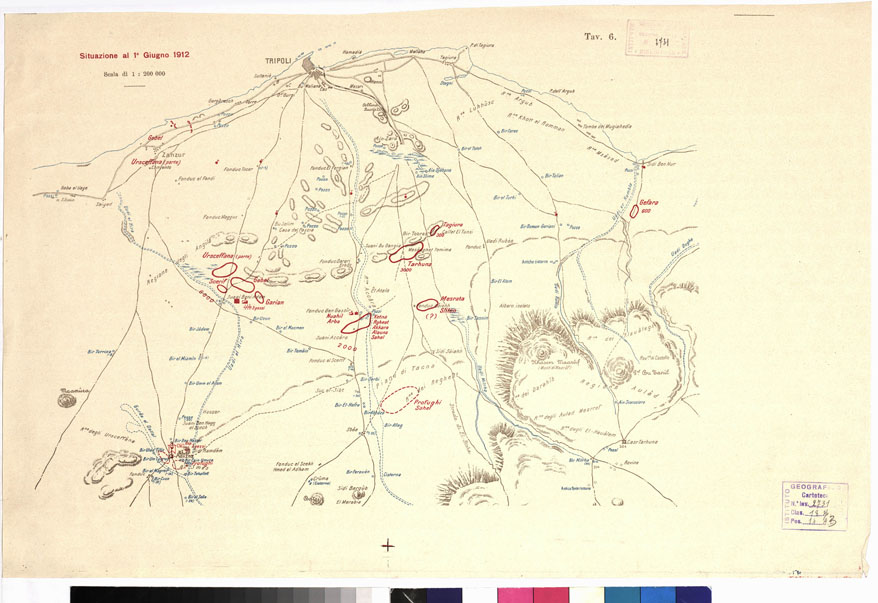 "SITUAZIONE AL 1 GIUGNO 1912. Scala 1:200.000. Dieci tavole a colori bistro per la planimetria e l'orografia (curve o tratteggio), azzurro per le acque, rosso per le indicazioni di carattere militare... dal 20-12-1911 AL 30-06-1912. "