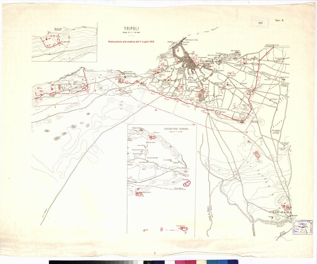 "Dislocazione alla mattina del 1 giugno 1912. Scala 1:25.000 (con cartina sussidiaria per Tagiura - Trik-Tarhuna). Dieci tavole a colori bistro per la planimetria e l'orografia (curve o tratteggio), azzurro per le acque, rosso per le indicazioni di carattere militare... dal 20-12-1911 AL 30-06-1912. Autore I.G.M."