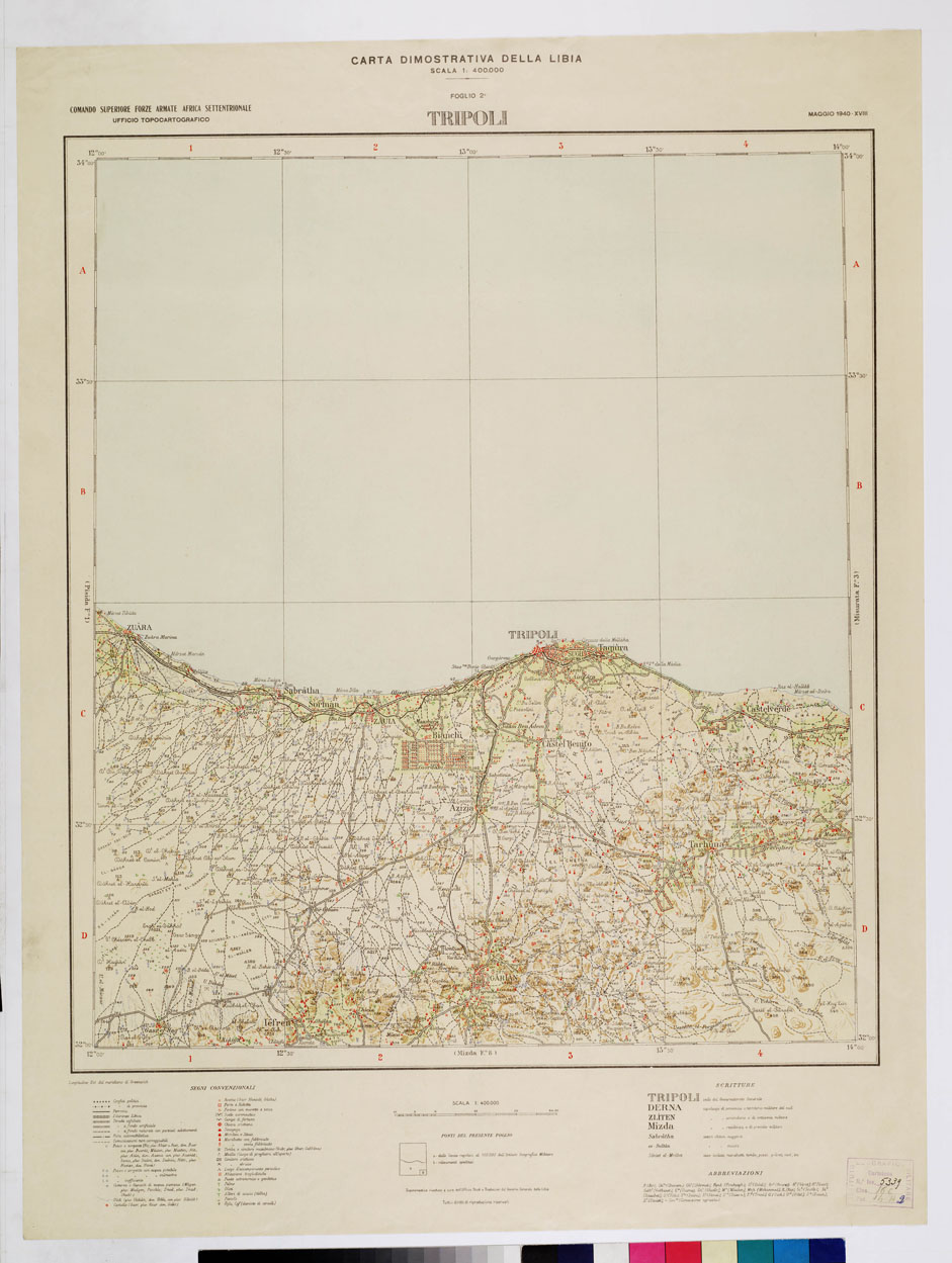 "Autore Ufficio Topocartografico - Comando Superiore delle Forze Armate Africa Settentrionale. Carta dimostrativa della Libia, derivata dalle levate al 100.000 dell' I.G.M. e dalla cartografia regolare Francese. La toponomastica è stata riveduta dall' Ufficio studi e Traduzioni del Governo Generale della Libia."