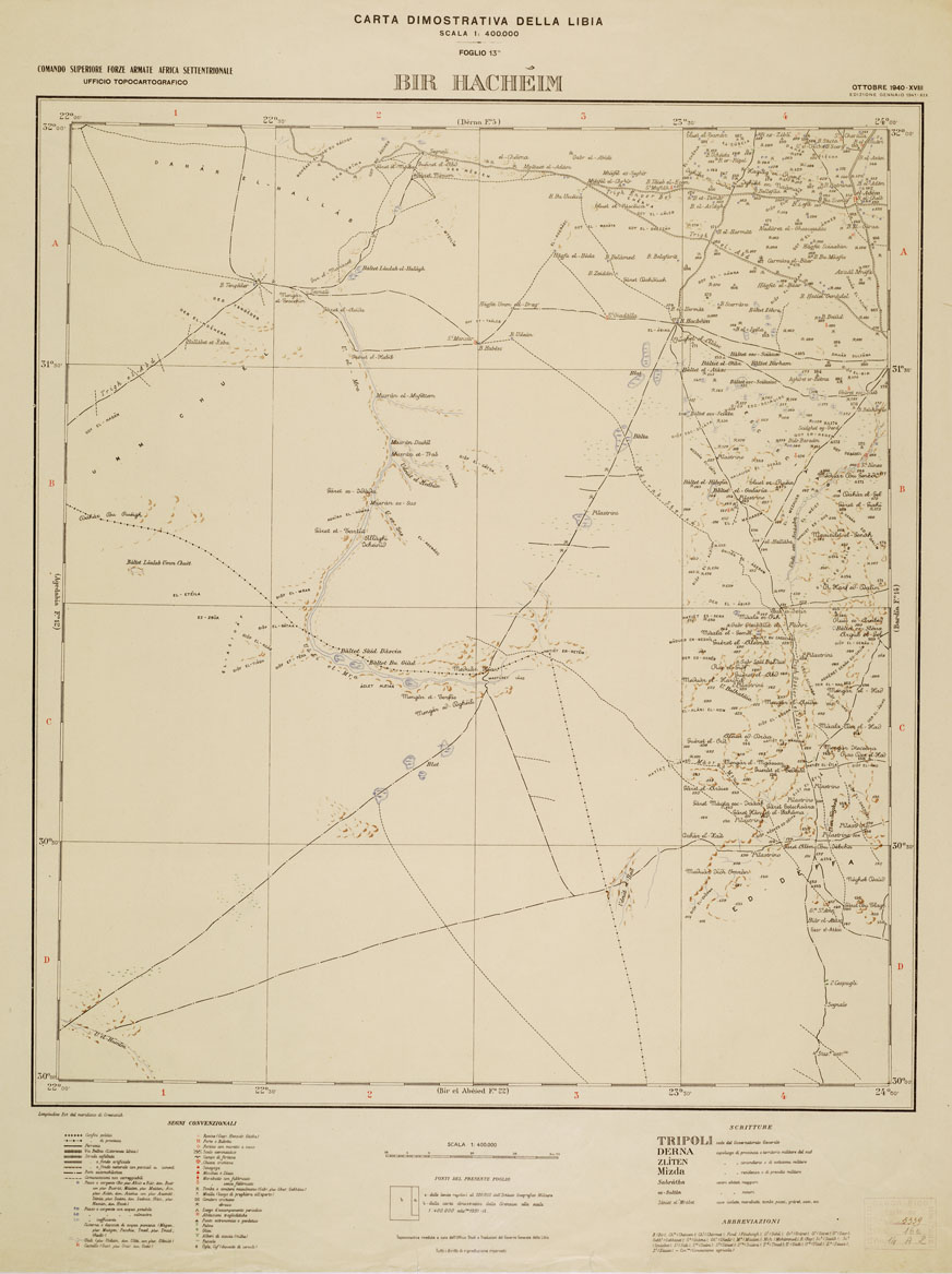 "Autore Ufficio Topocartografico - Comando Superiore delle Forze Armate Africa Settentrionale. Carta dimostrativa della Libia, derivata dalle levate al 100.000 dell' I.G.M. e dalla carta dimostrativa della Cirenaica del 1931. La toponomastica è stata riveduta dall' Ufficio studi e Traduzioni del Governo Generale della Libia."