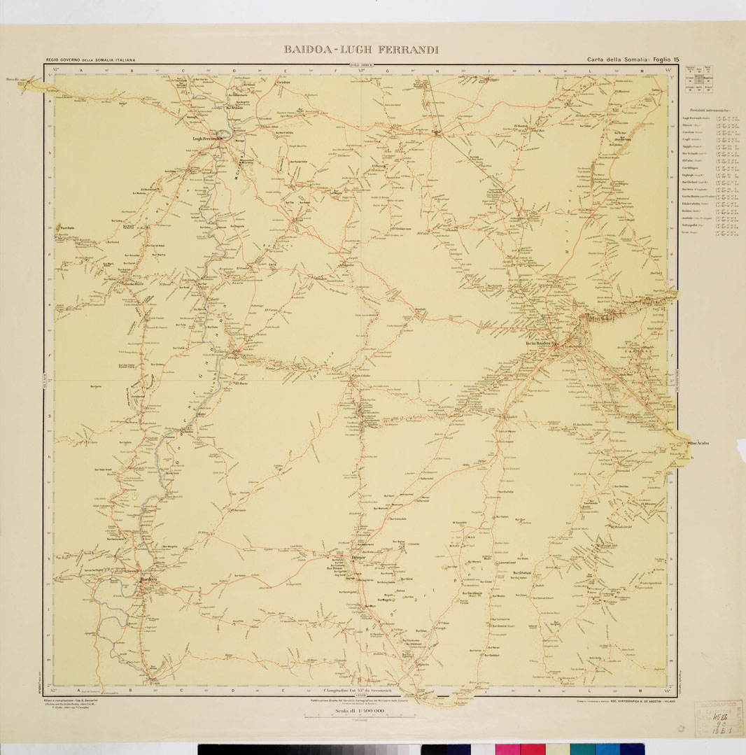 "R. Governo della Somalia Italiana Cap. G. Zaccarini. La carta è pubblicata sotto la direzione del Servizio Cartografico del Ministero delle Colonie (Dirett. A. Dordano). Rilievi e compilazione del Cap. G. Zaccarini disegno, incisione e stampa Soc. An. Prof. G. De Agostini, Milano. Il terreno è rappresentato a fondo unito giallino con orografia a curve dimostrative in bistro, nomi e vegetazioni in nero, acque in azzurro, strade in rosso. L'intera carta si comporrà di 22 fogli. Sono pubblicati i fogli: 1) Bender Cassin 4) Callis 7) Rocca Littorio 11) Belet Uen 12) El Bur 13) Obbia 16) Mogadiscio 17) Itala il foglio N°13 reca il "Piano di Obbia" (scala 1:10.000) il foglio N°13 reca il "Piano di Obbia" (scala 1:10.000) il foglio N° 17 "Dintorni di Itala" (scala 1:200.000). Ciascun foglio contiene 2° di longitudine per 2° di latitudine e reca indicate, in tabella apposita, le posizioni astronomiche di varie località. Le longitudini sono calcolate dal Meridiano di Greenwich."