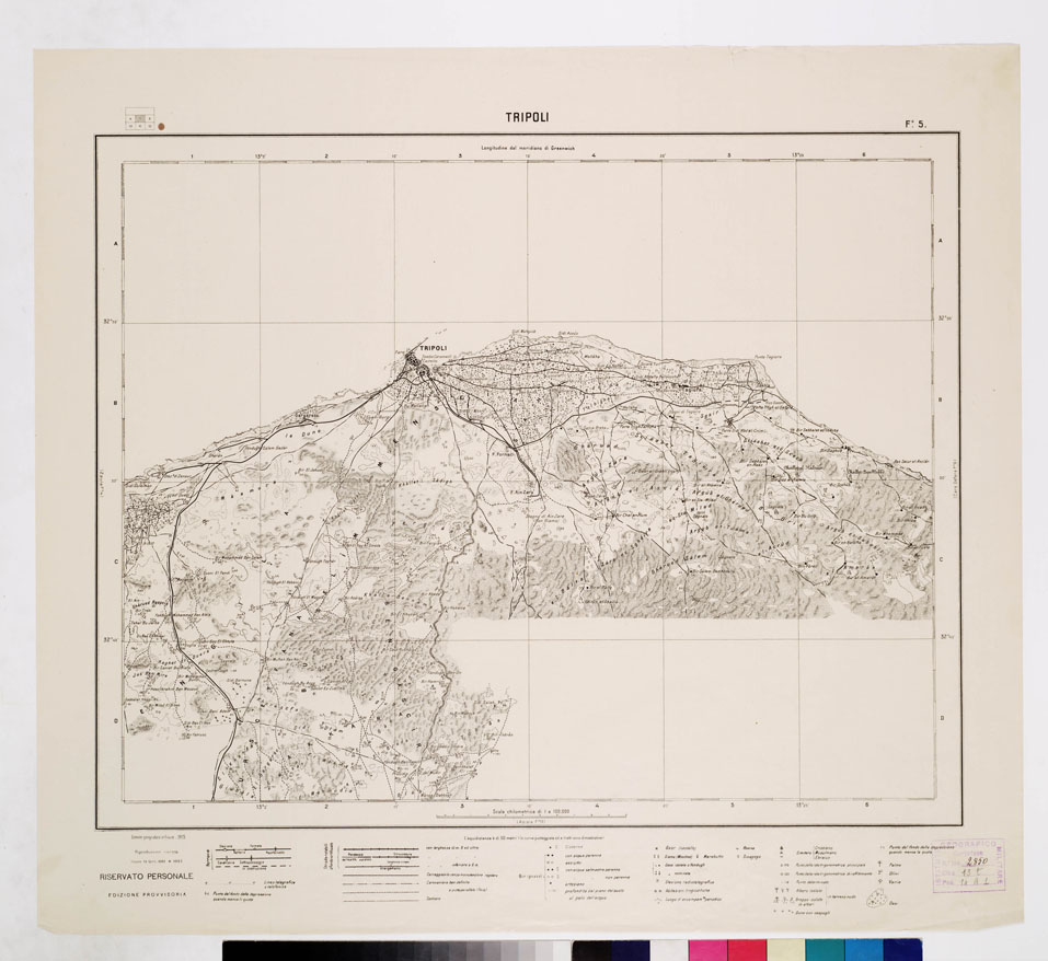 "Istituto Geografico Militare. La carta si compone di 14 fogli stampati in nero, con orografia dimostrata a mezzo di curve di livello tracciate all'equidistanza di 50 m. sussidiate da curve punteggiate ed a tratti dimostrative. La carta mostra ferrovie (in servizio e in costruzione), linee telegrafiche e telefoniche, strade, (rotabili a fondo artificiale con larghezza di 6 m. e oltre e con larghezza inferiore a 6 m., carreggiabili senza manutezione regolare, carovaniere a piste parallele manutezione regolare, carovaniere ben definite, carovaniere a piste parellele sentieri), cisterne, pozzi (con acqua perenne, asciutto, con acqua salmastra perenne o non perenne, artesiano), castelli, marabutti, case isolate, rovine, sinagoghe, abitazioni trogloditiche, luoghi di accompagnamento periodico, cimiteri (cristiani, munsulmani, ebraici), stazioni radiotelegrafiche, ecc., e distingue inoltre i vari tipi di vegetazione e i limiti delle oasi. I titoli dei vari fogli sono: 1) Bu Ghemmase 2) Zelten 3) Zuara 4) Zania 5) Tripoli 6) Gase Chair 7) Fòndugh En-Naggàza 11) Azizia 12) Tarhuma 13) Hons 14) Zliten 15) Misurata 20) Jeffren 21) Garian."