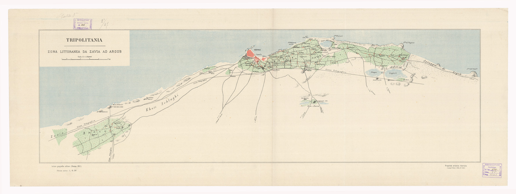 "I.G.M. Schizzo topografico ricavato in buona parte da levate fatte eseguire dal governo turco. È stampato a colori con scritture e strade in nero, abitazioni in rosso, vegetazioni in verde, acque in azzurro. La carta si estende a circa 20 km rispettivamente a est ed ovest da Tripoli. Essa fa parte delle pubblicazioni allestite dall'I.G.M. e messe in commercio all'epoca della nostra azione militare in Tripolitania."