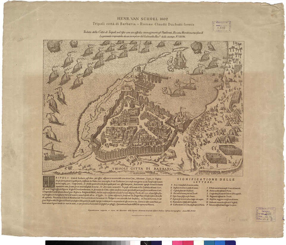 " ROMAE CLAUDII DUCHETTI FORMIS. VEDUTA DELLA CITTA' DI TRIPOLI NEL 1560 CON UN ASSEDIO IMMAGINARIO. CFR. MANFRONI. RIVISTA MARITTIMA 1913 ANNO IX. LA PRESENTE E' RIPRODOTTA DA UN ESEMPLARE DEL GABINETTO NAZ.LE DELLE STAMPE N°131196. Riproduzione eseguita a cura del Ministero delle Colonie - Direzione Generaole Affari Politici - Ufficio Cartografico anno 1915. Tipolitografia Ministero delle Colonie."