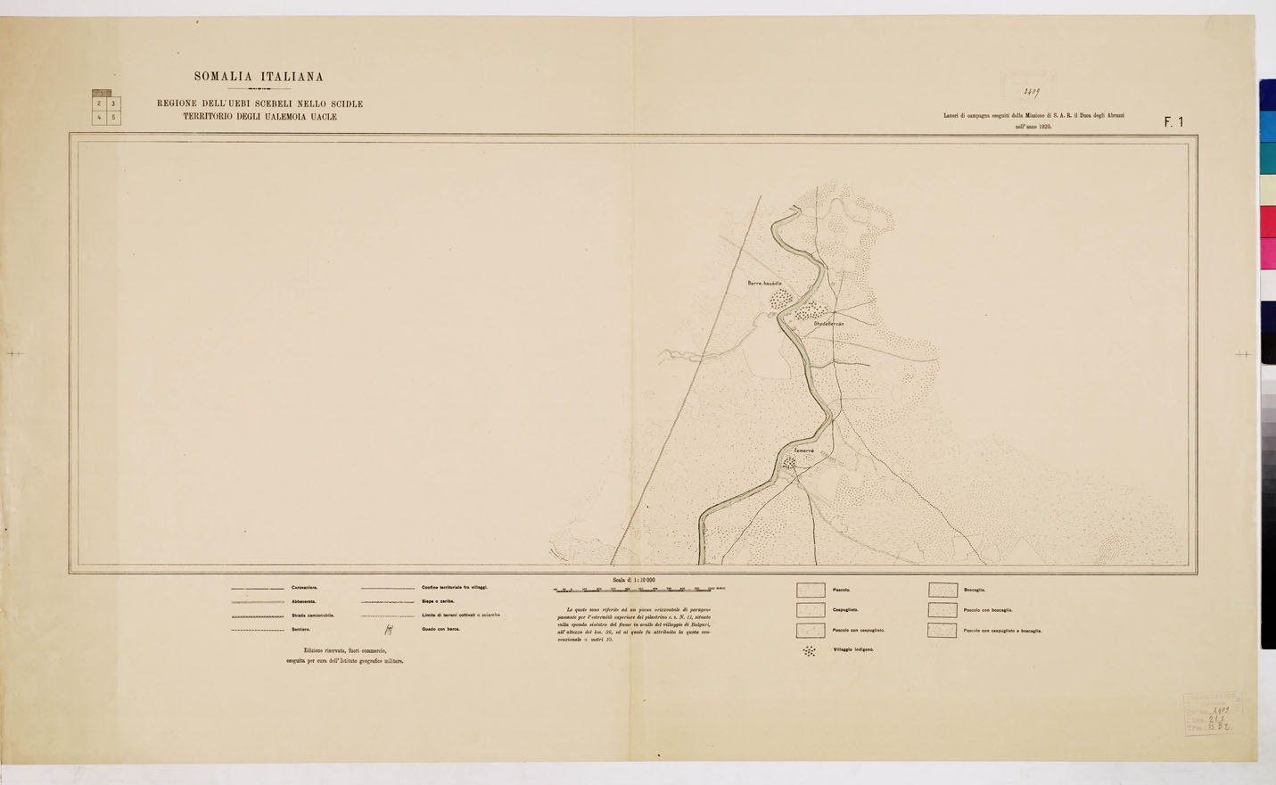 "I.G.M. Riproduzione dei lavori di rilievo eseguiti dalla Missione di S.A.R. il Duca degli Abruzzi che esplorò il corso dell'Uebi Scebeli nell'anno 1920. La carta consta di quattro fogli interi e un mezzo foglio, stampati in azzurro, il fondo acque, ed in nero, il restante. Il corso dell'Uebi Scebeli è tracciato dal villaggio di Racheilo Omar Gudle a quella di Barre-Hauàdle. Per la viabilità si sono impiegati particolari segni a distinguere le carovaniere, le strade camionabili, i sentieri. Sono indicati i confini territoriali fra villaggio, i limiti di terreni coltivati o sciambe e i diversi tipi di vegetazione. Le quote furono riferite al piano orizzontale di paragone passante per l'estremità superiore del pilastrino c. s. n.11 situato sulla sponda sinistra del fiume a valle del villaggio di Balguri all'altezza di km. 36, con quota convenzionale + m. 10, e determinate mediante un livello a cannocchiale munito di circolo azimutale. La carta portò un grande contributo alla raffigurazione del corso dell'Uebi Scebeli. Della carta fu anche eseguita una riduzione in tre fogli al 20.000."