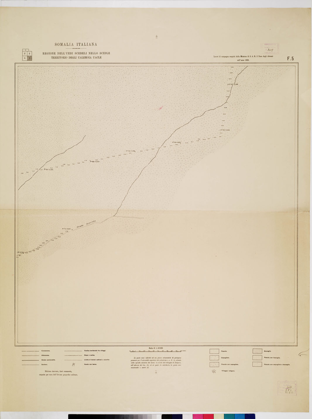 "I.G.M. Riproduzione dei lavori di rilievo eseguiti dalla Missione di S.A.R. il Duca degli Abruzzi che esplorò il corso dell'Uebi Scebeli nell'anno 1920. La carta consta di quattro fogli interi e un mezzo foglio, stampati in azzurro, il fondo acque, ed in nero, il restante. Il corso dell'Uebi Scebeli è tracciato dal villaggio di Racheilo Omar Gudle a quella di Barre-Hauàdle. Per la viabilità si sono impiegati particolari segni a distinguere le carovaniere, le strade camionabili, i sentieri. Sono indicati i confini territoriali fra villaggio, i limiti di terreni coltivati o sciambe e i diversi tipi di vegetazione. Le quote furono riferite al piano orizzontale di paragone passante per l'estremità superiore del pilastrino c. s. n.11 situato sulla sponda sinistra del fiume a valle del villaggio di Balguri all'altezza di km. 36, con quota convenzionale + m. 10, e determinate mediante un livello a cannocchiale munito di circolo azimutale. La carta portò un grande contributo alla raffigurazione del corso dell'Uebi Scebeli. Della carta fu anche eseguita una riduzione in tre fogli al 20.000."
