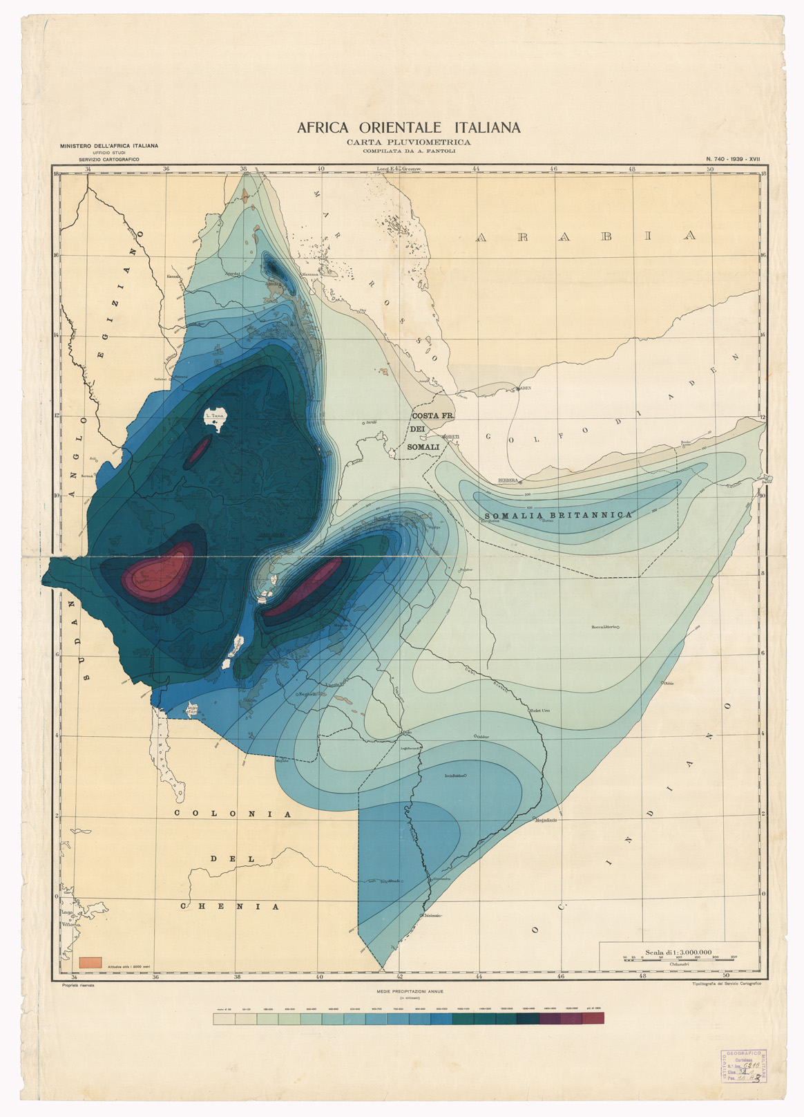 "Ministero dell'Africa Italiana. Ufficio studi - Servizio Cartografico. Sitratta di una carta pluviometrica compilata dal Prof. A. Fantoli."