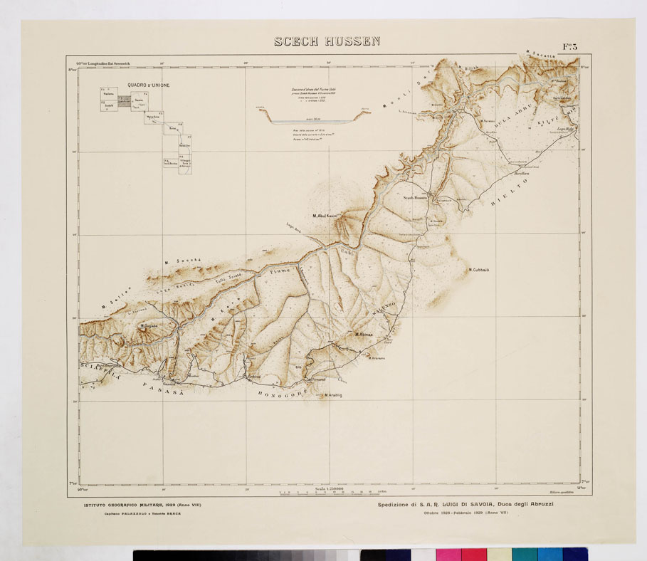 CARTA ITINERARIA DELLA SPEDIZIONE DI S.A.R. LUIGI DI SAVOIA DUCA DEGLI ABRUZZI PER L'ESPLORAZIONE DELLO UABI-UEBI SCEBELI 1928-1929 - Foglio 3 SCECH HUSSEN
