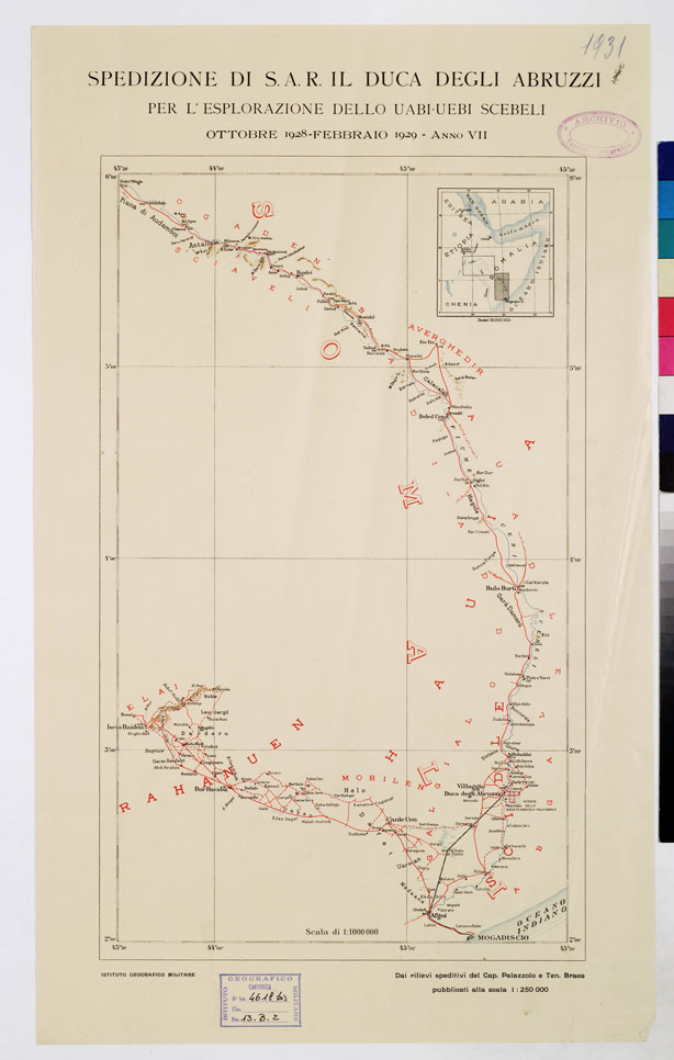 CARTA ITINERARIA DELLA SPEDIZIONE DI S.A.R. LUIGI DI SAVOIA DUCA DEGLI ABRUZZI PER L'ESPLORAZIONE DELLO UABI-UEBI SCEBELI 1928-1929 - Foglio 1