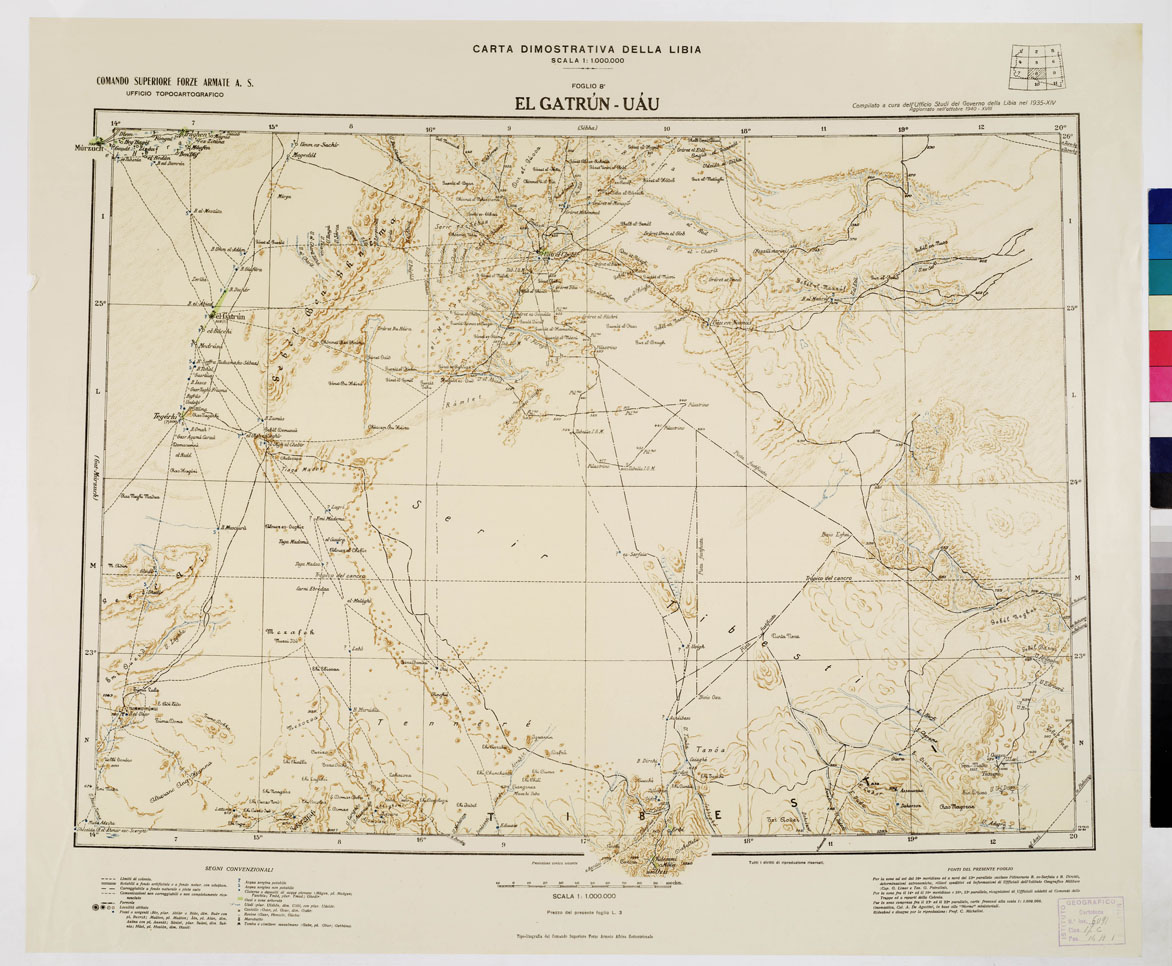 "Comando Superiore Fore Armate Africa Settentrionale - Ufficio Topocartografico. Carta dimostrativa, compilato a cura dell'Ufficio Studi. Aggiornato parzialmente nel 1940 dall' Ufficio Topocartografico. Determinazioni astronomiche, rilievi speditivi ed informazioni di Ufficiali dell' I.G.M. Cap. G. Limer Ten. G. Petrolini e per taluni tratti Ten. E. Pina. Ricognizioni ufficiali addetti al comando delle truppe ed a reparti della Colonia. Schizzo dimostrativo della Tripolitania Settentrionale alla scala di 1:400.000 del Ministero delle Colonie. Per il territorio oltre confine carte francesi alla scala di 1:1.000.000. Tipolitografia dfel Comando Superiore delle Forze Armate."