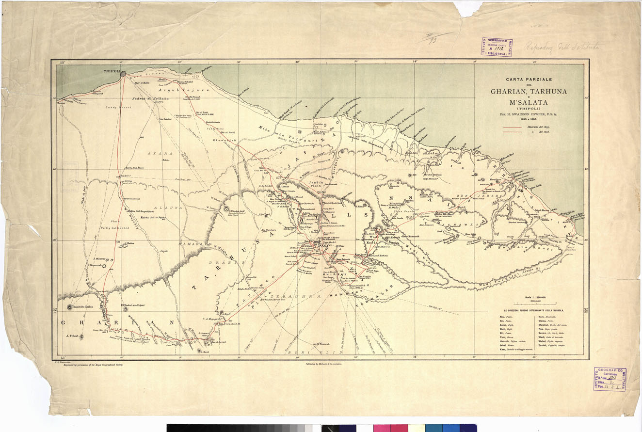 "Riproduzione dell' I.G.M. della carta di H. Swainson Cowper, con tracciati gli itinerari dei suoi viaggi del 1895-1896. La carta fu pubblicata da Methuen e C., Londra su disegno di F. E. Ravenstein. Venne ristampata con l'autorizzazione della R. Società Geografica di Londra. È in tre colori."