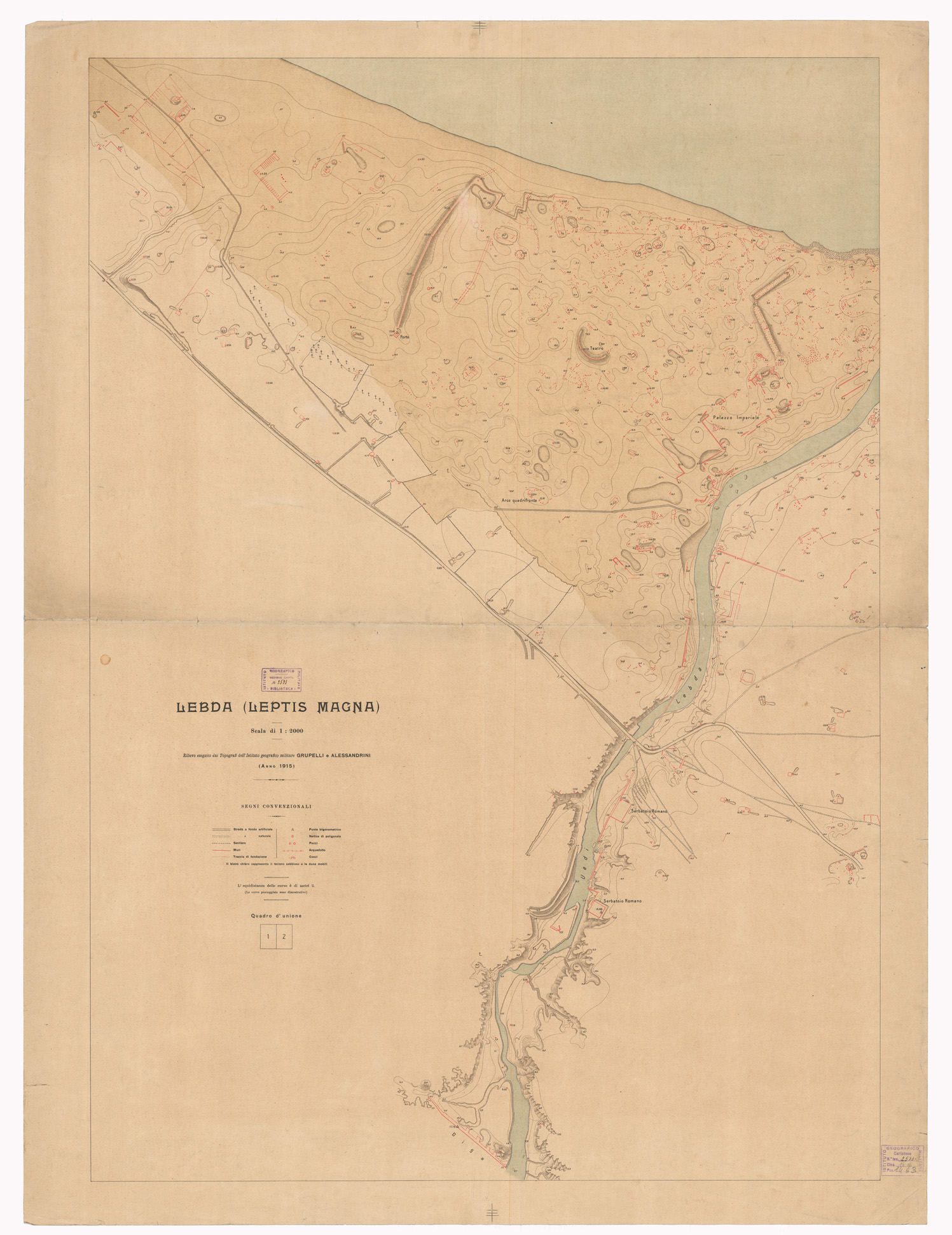 "I.G.M. Rilievo eseguito dai topografi dell'I.G.M. Grupelli e Alessandrini durante la campagna topografica coloniale del 1914-1915. Un foglio in cromo con rilievo orografico a curve di livello tracciate all'equidistanza di 2 metri e curve punteggiate dimostrative. Per il terreno sabbioso e le dune mobili si è impiegato una tinta in bistro chiaro. Gli altri colori usati sono il rosso per le tracce di fondazione, muri, pozzi, acquedotti, ecc. l'azzurro per le acque il nero per le strade, i sentieri, le scritture. Numerose le quote altimetriche. 2533 e 2533Bis."