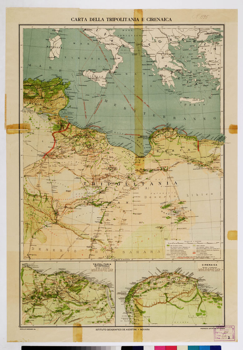 "Istituto Geografico De Agostini, Novara. Carta fisico-politica costruita da A. Dardano. Distingue le terre coltivati e dimostra la varia natura del terreno rappresentato. Sono tracciate le reti ferroviarie e stradali e i confini. È anche indicata la distribuzione etnografica. La carta è contenuta in un sol foglio che comprende anche il bacino del Mediterraneo con l'indicazione delle vie di comunicazione marittima tra l'Africa e l'Italia, e due cartine supplementari per la Tripolitania settentrionale e la Cirenaica alla scala di 1:2.000.000. Le longitudini sono riferite al meridiano di Greenwich. Il foglio è piegato a libretto con inserita una piantina dei Dintorni di Tripoli alla scala di 1:35 000. "