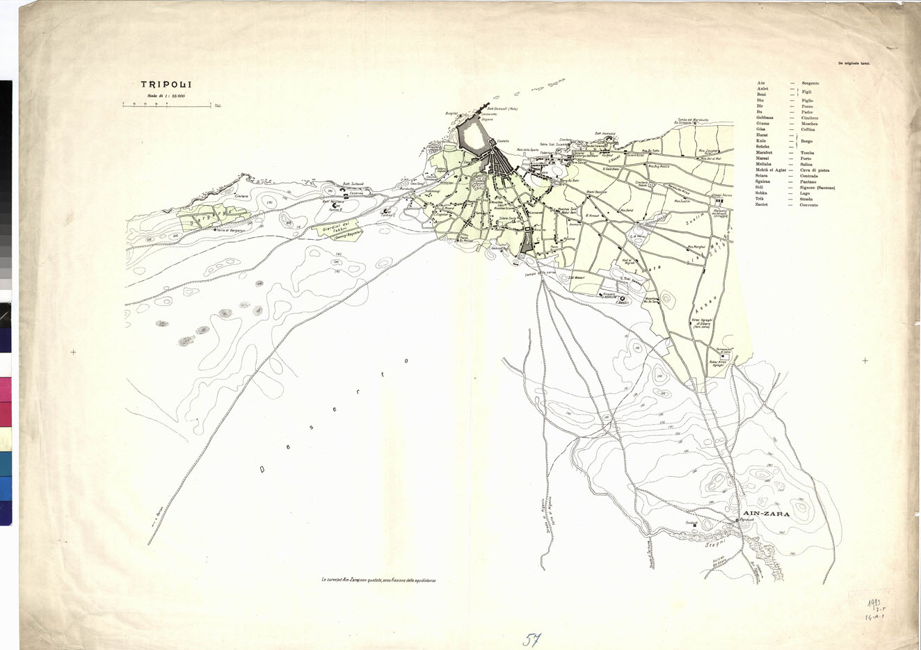 "I.G.M. Tre fogli ricavati da una copia di una levata speditiva eseguita da ufficiali turchi, pervenuta in nostro possesso all'epoca della occupazione militare della Libia. Stampati in due colori essi mostrano il rilievo orografico con curve di livello punteggiate all'equidistanza di 5 metri con curve intermedie non quotate, frazione della equidistanza, per la regione di Ain-Zara. Su ciascun foglio è riportato un breve glossario arabo-italiano."