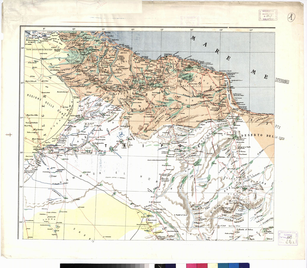 "I.G.M. Questa carta è basata sul materiale cartografico raccolto dall' I.G.M. in previsione degli avvenimenti che portarono alla guerra italo-turca ed all'occupazione italiana della Libia. Furono così compilate carte generali e piani su la base dei migliori documenti allora esistenti e delle ricognizioni parziali effettuate sui luoghi. Tali documenti cartografici, allestiti fin dal 1885 e tenuti per quanto possibile al corrente, furono poi utilizzati al momento dello scoppio delle ostilità e servirono oltre che per questa carta per tutte le altre che precedettero i veri e propri lavori geodetici e topografici iniziati nel 1912. La carta fu stampata in quattro fogli. Il territorio rappresentato si estende dal 22° al 33° parallelo e dal 9° al 25° meridiano. Le tinte impiegate oltre il bianco per la pianura pietrosa o altipiano nel deserto, sono il giallino per il deserto di sabbia, il bistro per le steppe, il verde per le oasi e le regioni coltivate. Il rilievo orografico è rappresentato col tratteggio in bistro sussidiato da alcune quote altimetriche. L' idrografia è tracciata in azzurro, la rete stradale (carovaniere, carovaniere seguite da linee telegrafiche, carovaniere dedotte da itinerari) in rosso. I centri abitati sono distinti secondo la loro iimportanza amministrativa. Le longitudini si riferiscono al meridiano di Greenwich. La carta venne compilata presso l'Ufficio Militare dal Cap. Gianni e dal Top. Uff. Juglaris. Essa fu pubblicata anche in un solo grande foglio di m. 0,84 x 1,08 con cartine sussidiarie per Marsa Tobruh (1:58 000) ridotta dai rilievi della marina inglese, Ancoraggio di Homs (scala circa 1 : 25 000) e Bengasi e dintorni (1 : 50 000) tratte dalle carte idrografiche, Dintorni di Tripoli (1: 25 000) desunta da informazioni originali con elenco numerico delle costruzioni e alcune note topografiche. Stampa 1911. + SCHIZZO DIMOSTRATIVO DELLA RETE TELEGRAFICA."