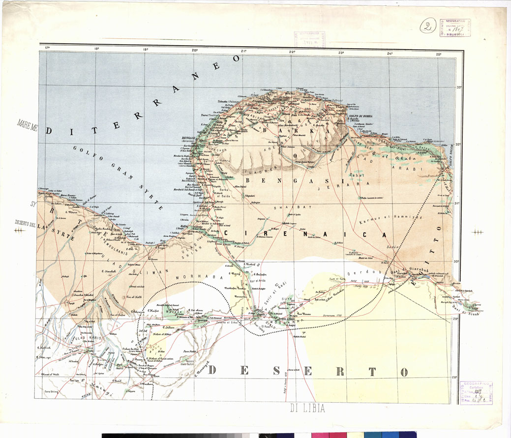 "I.G.M. Questa carta è basata sul materiale cartografico raccolto dall' I.G.M. in previsione degli avvenimenti che portarono alla guerra italo-turca ed all'occupazione italiana della Libia. Furono così compilate carte generali e piani su la base dei migliori documenti allora esistenti e delle ricognizioni parziali effettuate sui luoghi. Tali documenti cartografici, allestiti fin dal 1885 e tenuti per quanto possibile al corrente, furono poi utilizzati al momento dello scoppio delle ostilità e servirono oltre che per questa carta per tutte le altre che precedettero i veri e propri lavori geodetici e topografici iniziati nel 1912. La carta fu stampata in quattro fogli. Il territorio rappresentato si estende dal 22° al 33° parallelo e dal 9° al 25° meridiano. Le tinte impiegate oltre il bianco per la pianura pietrosa o altipiano nel deserto, sono il giallino per il deserto di sabbia, il bistro per le steppe, il verde per le oasi e le regioni coltivate. Il rilievo orografico è rappresentato col tratteggio in bistro sussidiato da alcune quote altimetriche. L' idrografia è tracciata in azzurro, la rete stradale (carovaniere, carovaniere seguite da linee telegrafiche, carovaniere dedotte da itinerari) in rosso. I centri abitati sono distinti secondo la loro iimportanza amministrativa. Le longitudini si riferiscono al meridiano di Greenwich. La carta venne compilata presso l'Ufficio Militare dal Cap. Gianni e dal Top. Uff. Juglaris. Essa fu pubblicata anche in un solo grande foglio di m. 0,84 x 1,08 con cartine sussidiarie per Marsa Tobruh (1:58.000) ridotta dai rilievi della marina inglese, Ancoraggio di Homs (scala circa 1 : 25.000) e Bengasi e dintorni (1 : 50 000) tratte dalle carte idrografiche, Dintorni di Tripoli (1: 25 000) desunta da informazioni originali con elenco numerico delle costruzioni e alcune note topografiche. Stampa 1911. ... + SCHIZZO DIMOSTRATIVO DELLA RETE TELEGRAFICA."