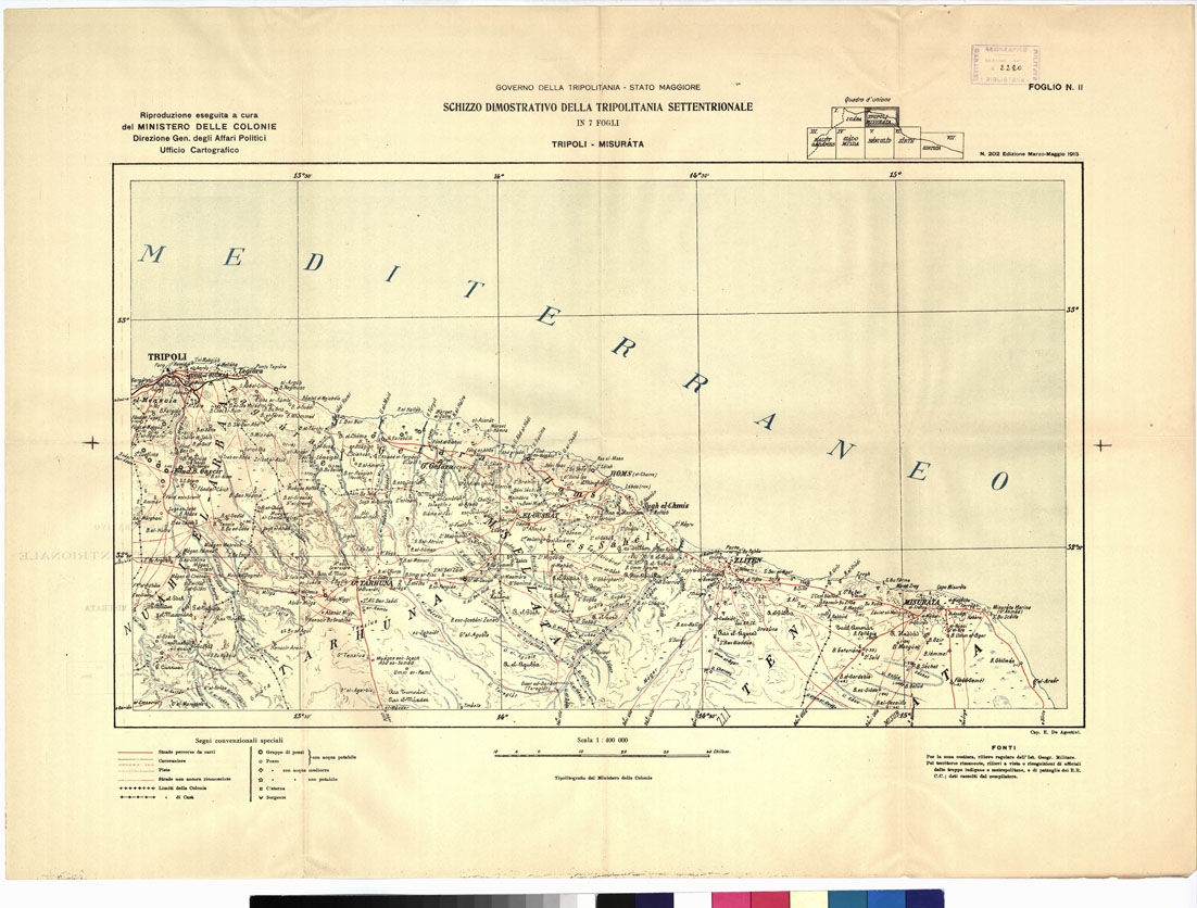 "Governo della Tripolitania. Servizio Cartografico del Ministero delle Colonie. La carta si compone di sette fogli estesi sulla costa alla zona compresa tra i confini della Tunisia e la Sirtica e nell'interno fino al 30° parallelo lat. nord. La carta è stampata a colori con orografia rappresentata dimostrativamente a curve di livello in bistro, idrografia in azzurro, rete stradale in rosso scritture e confini in nero. Particolarmente dimostrate sono le condizioni idrologiche della regione. Ogni foglio porta indicate le fonti sulle quali è basata la compilazione. in generale per la zona costiera veniva usufruito il rilievo regolare dell'I.G.M. e per il rimanente del territorio rilievi a vista e ricognizioni di ufficiali delle truppe indigene, itinerari di pattuglie dei R.R. Carabinieri e dello stesso compilatore (Cap. E. De Agostini). I titoli dei fogli sono: 1)Zuara 2) Tripoli Misurata 3) Nalùt Gadames 4) Giado Mizda 5) Béniulid 6) Sirte 7) Sirtica. Della carta esiste un'edizione più antica datata al 1915-1916 (v. N. 2220 d' inventario gen.) con annessa una carta della regione sirtica al 400.000 e l'elenco dei nomi di località. + CARTA REGIONALE SIRTICA- REGIONE DELLA SIRTICA"