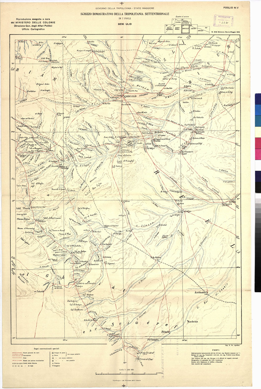 "Governo della Tripolitania. Servizio Cartografico del Ministero delle Colonie. La carta si compone di sette fogli estesi sulla costa alla zona compresa tra i confini della Tunisia e la Sirtica e nell'interno fino al 30° parallelo lat. nord. La carta è stampata a colori con orografia rappresentata dimostrativamente a curve di livello in bistro, idrografia in azzurro, rete stradale in rosso scritture e confini in nero. Particolarmente dimostrate sono le condizioni idrologiche della regione. Ogni foglio porta indicate le fonti sulle quali è basata la compilazione. in generale per la zona costiera veniva usufruito il rilievo regolare dell'I.G.M. e per il rimanente del territorio rilievi a vista e ricognizioni di ufficiali delle truppe indigene, itinerari di pattuglie dei R.R. Carabinieri e dello stesso compilatore (Cap. E. De Agostini). I titoli dei fogli sono: 1)Zuara 2) Tripoli Misurata 3) Nalùt Gadames 4) Giado Mizda 5) Béniulid 6) Sirte 7) Sirtica. Della carta esiste un'edizione più antica datata al 1915-1916 (v. N. 2220 d' inventario gen.) con annessa una carta della regione sirtica al 400.000 e l'elenco dei nomi di località. + CARTA REGIONALE SIRTICA- REGIONE DELLA SIRTICA"