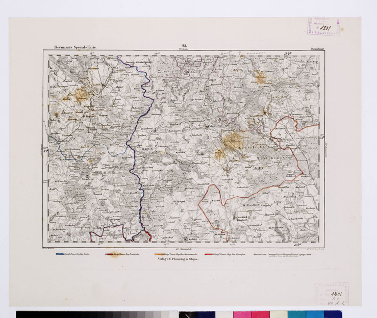 "Autore Reymann. Titolo in nero colorata a mano. Rappresentazione orografica a tratteggio."