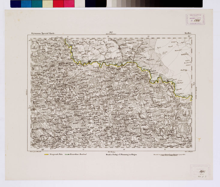 "Autore Reymann. Titolo in nero colorata a mano. Rappresentazione orografica a tratteggio."
