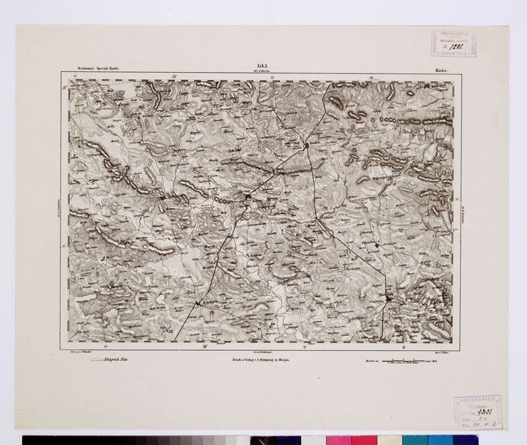 "Autore Reymann. Titolo in nero colorata a mano. Rappresentazione orografica a tratteggio."