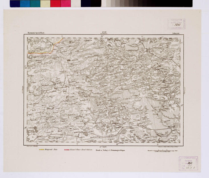 "Autore Reymann. Titolo in nero colorata a mano. Rappresentazione orografica a tratteggio."
