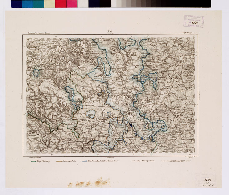 "Autore Reymann. Titolo in nero colorata a mano. Rappresentazione orografica a tratteggio."