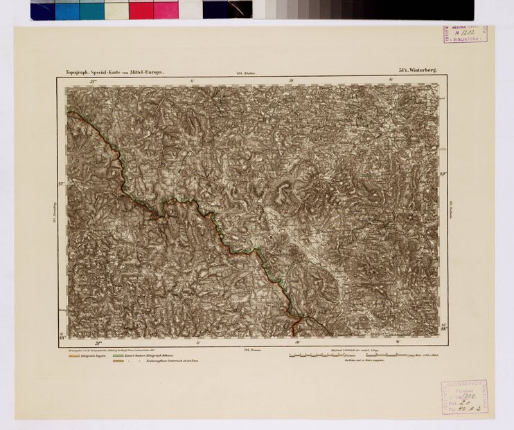 "Autore Reymann, luogo di edizione Berlino. Rappresentazione orografica a tratteggio. Tipo in nero colorato a mano."