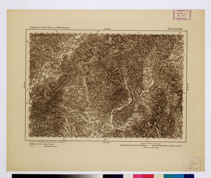 "Autore Reymann, luogo di edizione Berlino. Rappresentazione orografica a tratteggio. Tipo in nero colorato a mano."