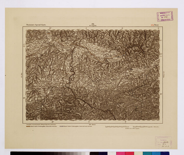 "Autore Reymann, luogo di edizione Berlino. Rappresentazione orografica a tratteggio. Tipo in nero colorato a mano."