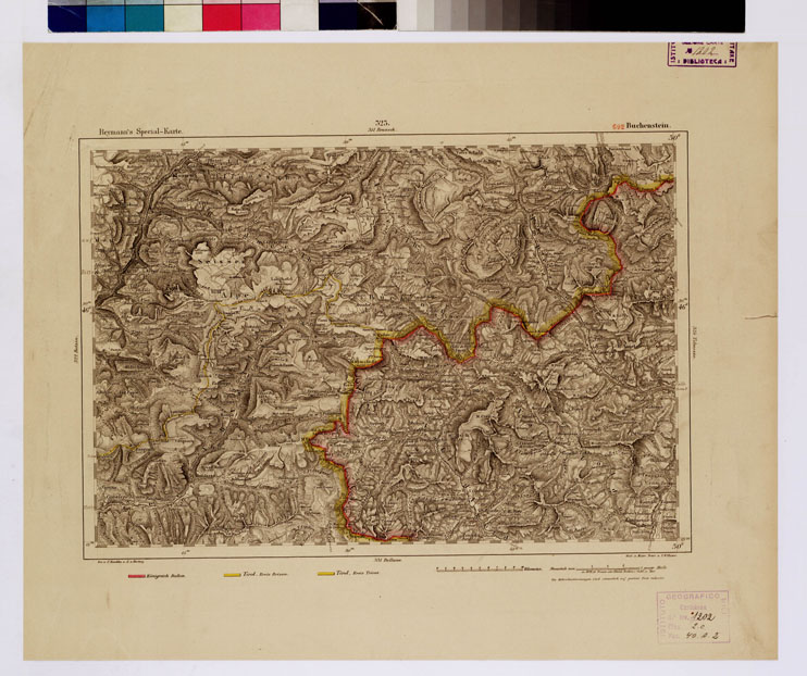 "Autore Reymann, luogo di edizione Berlino. Rappresentazione orografica a tratteggio. Tipo in nero colorato a mano."