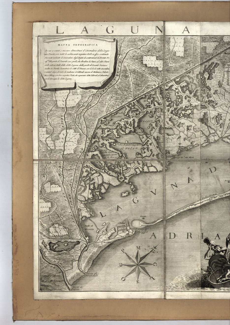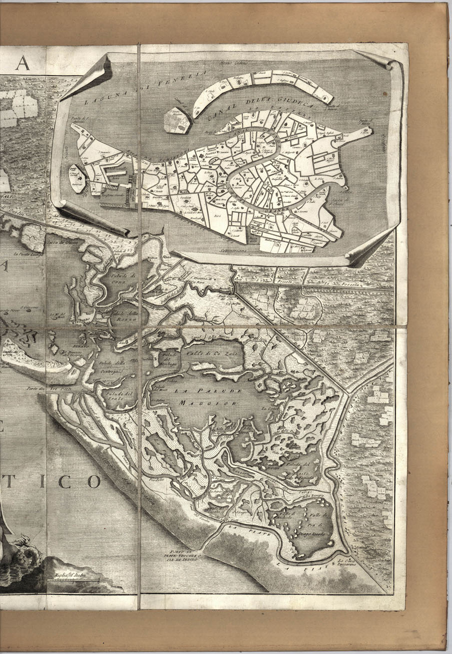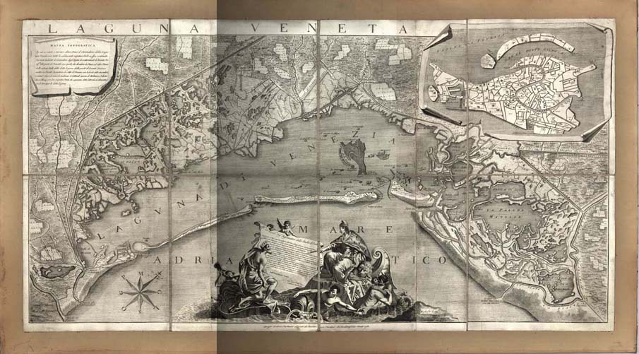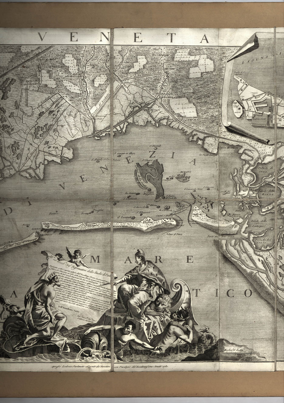 "PIU' RESTA INDICATO IL CIRCONDARIO DEGLI ARIGINI DI CONTERMINAZ.E DI BRENTA NOVIS.MA ALLA PARTE DI PONENTE: COSI' QUELLI CHE DIVIDONO LA PIAVE, ED ALTRI FIUMI DALLE INTERNE VALLI DELLA DETTA LAGUNA DALLA PARTE DI LEVANTE. RAVISASI INOLTRE IN PIANTA GEOMETRICA LA CITTA' DI VENEZIA CON LE ISOLE TUTTE CIRCONDARIE E VARIAM.TE DISPOSTE ENTRO LA MEDESIMA: LI LITTORALI ANCORA DI MALAMOCO, PELESTRINA, E CHIOZA, CON LORO RESPETIVI PORTI, CHE SEPARANO DETTI LITTORALI ED ALIMENTANO CON LE LORO ACQUE LA DETTA LAGUNA. APPRESSO LODOVICO FURLANETTO. Incisione su rame in tre fogli riuniti e montati su tela a stacchi. Orientazione: nord spostato a destra. In alto a destra la pianta geometrica di Venezia. In basso al centro la dedica ai Sig. Riformatori dello studio di Padova. Scala grafica in miglia d'Italia. Cfr. MARINELLI, Saggio, ecc., n. 1223."