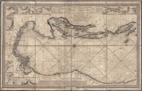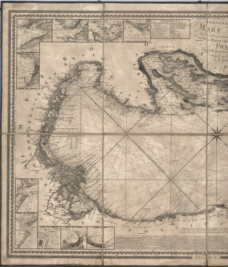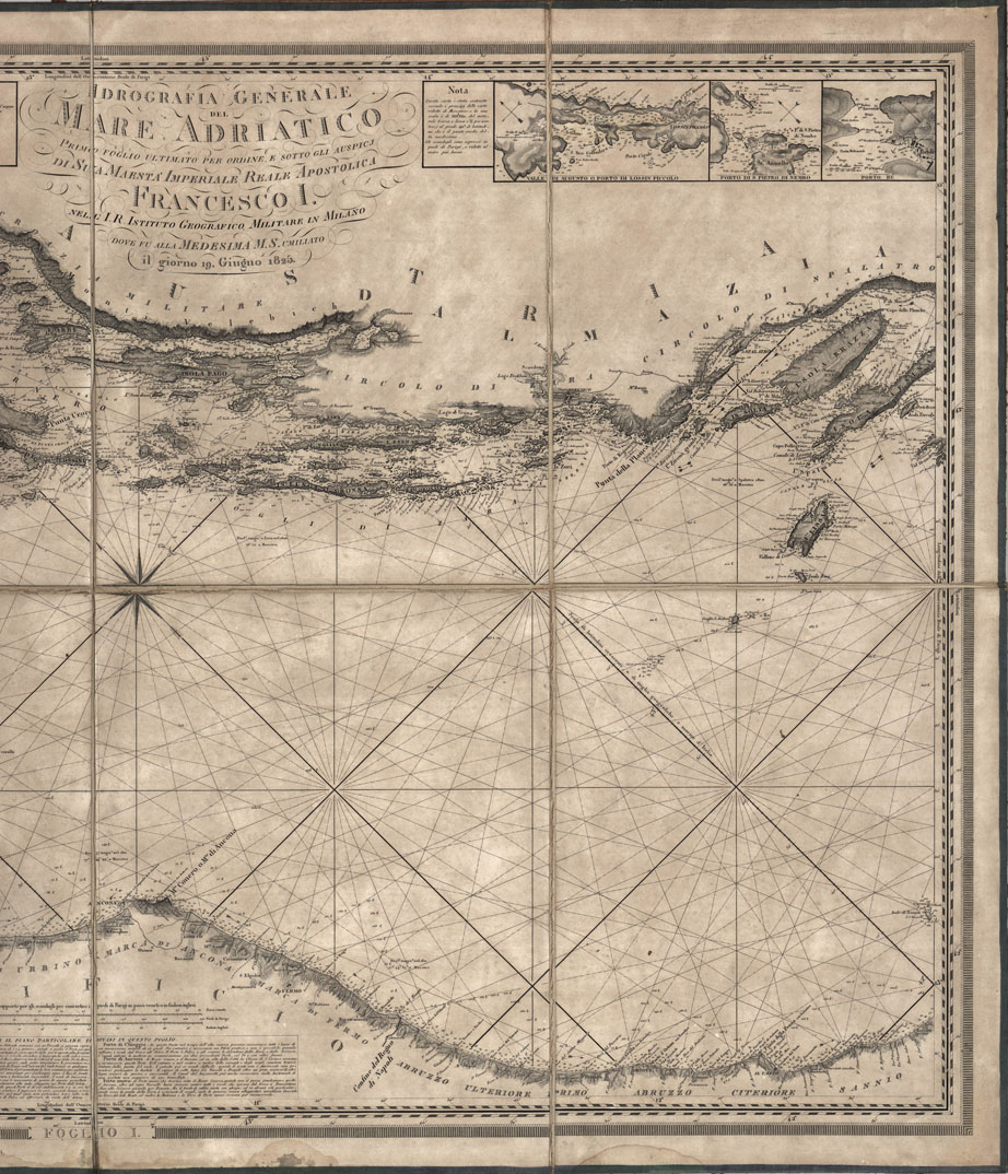 "PRIMO FOGLIO ULTIMATO PER ORDINE E SOTTO GLI AUSPICI DI SUA MAESTA' IMPERIALE APOSTOLICA FRANCESCO I NELL'I. R. I.G.M. IN MILANO DOVE FU ALLA MEDESIMA M. S. UMILIATO IL GIORNO 19 GIUGNO 1825. FOGLIO II. Carta in due fogli riduzione della grande "Carta di cabotaggio del mare Adriatico, disegnata e incisa sotto la direzione dell'I. R. Stato Maggiore Generale, ecc.", in 20 fogli alla scala di 1:175.000, pubblicata negli anni 1822 e 1824 (Cfr. MARINELLI, Saggio, ecc., N° 1562). Longitudini riferite al meridiano di Parigi. Sul primo foglio è scritto in basso a sinistra "Incisa nel C. R. I.G.M. sotto la vigilanza del Sig. G. Bordiga, Capo Incisore". I due fogli comprendono l'intero Adriatico fino all'Isola di Corfù. Rappresentano il terreno costiero per qualche chilometro verso l'interno, con orografia a tratteggio. La carta è ricca di particolari idrografici. Gli scandagli sono calcolati in piedi di Parigi riferiti alla bassa marea. Per molti punti è indicata la declinazione magnetica. Ambedue i fogli recano lungo i margini cartine di porti e di rade, a varie scale maggiori, e relative notizie illustrative. Il foglio primo contiene, oltre la leggenda dei segni convenzionali, una nota relativa alla costruzione della carta. Il foglio secondo contiene notizie circa le coste, i venti, le maree e le correnti dell'Adriatico. Cfr. MARINELLI, Saggio, ecc., N° 1590)."