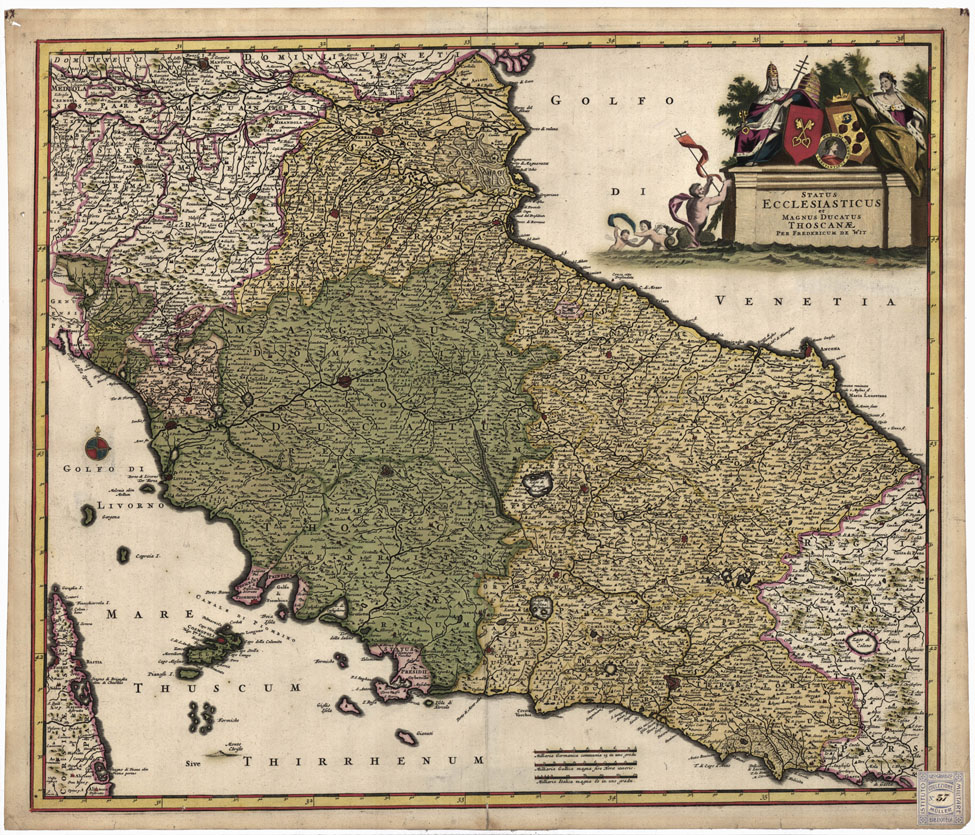 "...PER FEDERICUM DE WIT AMSTELODAMI APUD I. COVENS ET C. MORTIER. Foglio unico inciso su rame. Orientazione normale. Longitudini calcolate dalle isole del Capo Verde. Limiti: nord, Mantova sud, Gaeta ovest, Spezia est, Civita di Pena. Orografia prospettica a monticelli. Abitati importanti rappresentati schematicamente in pianta e riempiti in rosso, gli altri con torri e case. Manca la rete stradale. Confini statali a colori nella copia n. 37 bis (B0008272). Cfr. ARRIGONI E BERTARELLI, Le carte geografiche dell'Italia, ecc., N° 2088. Cfr. anche la stessa carta al numero di File B0007244 - Coll. Muller n. 38."