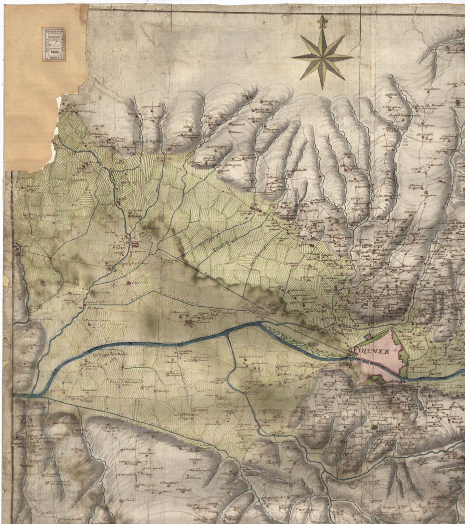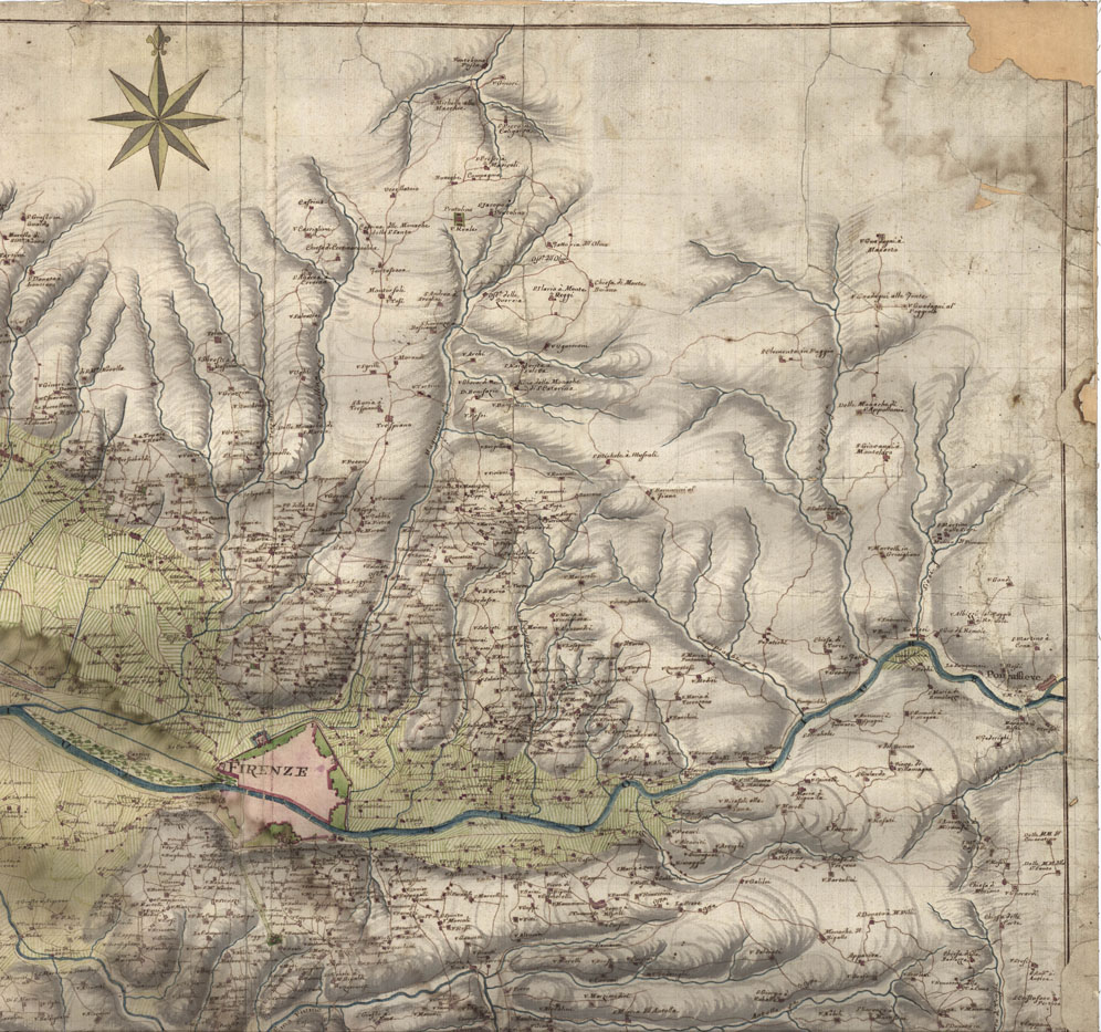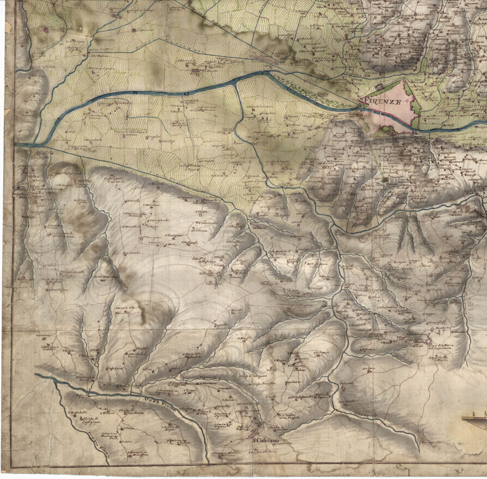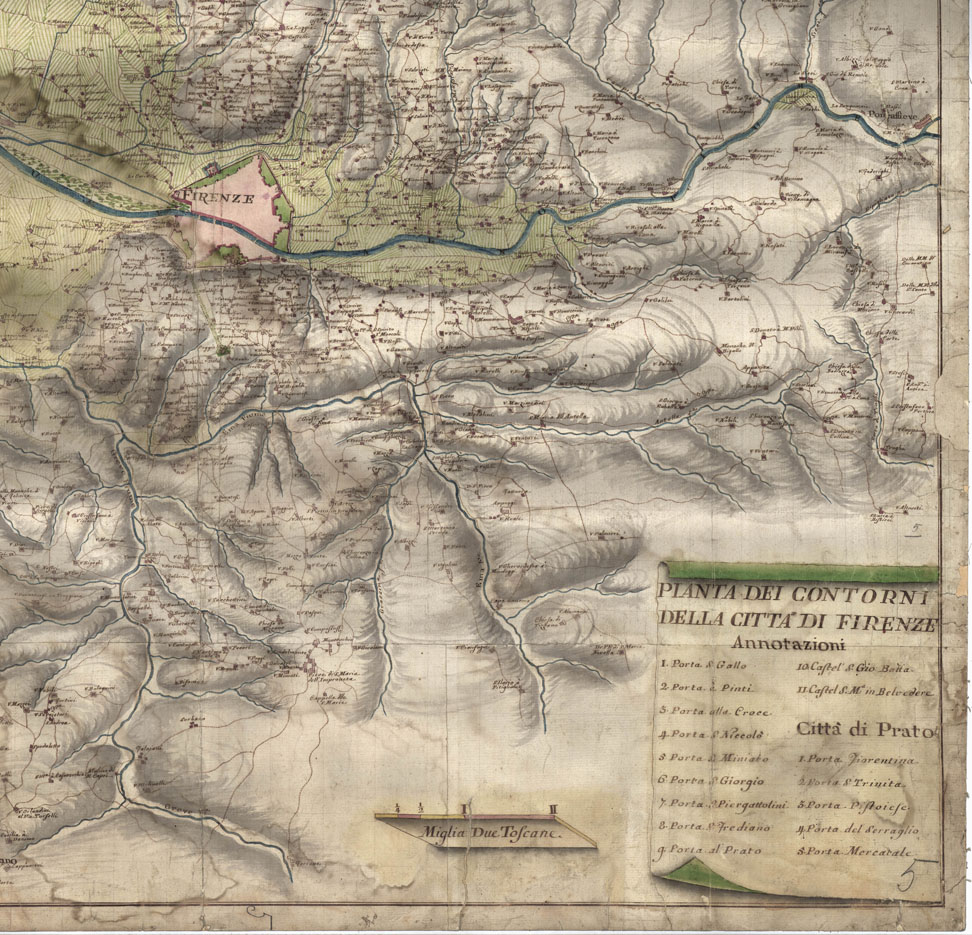 "Epoca secolo XVIII. Scala 1.30.000 circa. Dimensioni m. 87x91. Interessante carta manoscritta acquerellata, a colori rosso per gli abitati e le strade, azzurro per le acque, verde per le colture. Gli abitati sono rappresentati schematicamente in pianta. Per Firenze e Prato è dato apposito elenco numerico delle porte di città. La scala grafica è in miglia toscane. La ricchezza dei nomi conferisce un particolare valore storico alla carta."