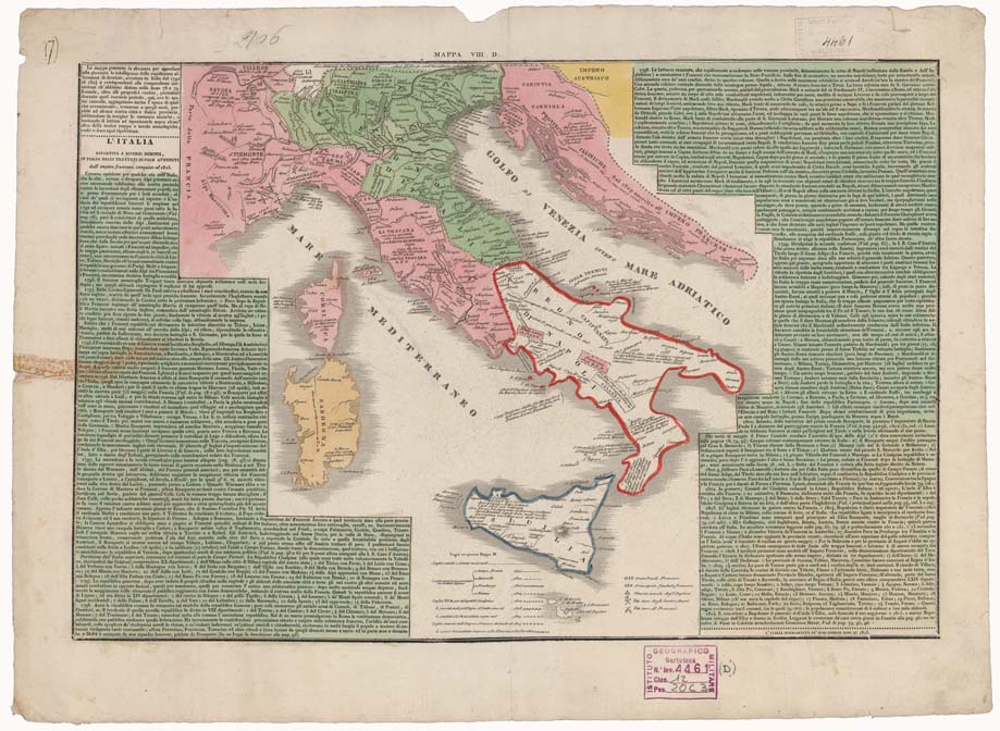 "Quattro tavole incise su rame stampate a colori con estese notizie storiche. Si riferiscono a un testo storico non precisato. Tav. A - L'Italia con le principali sue divisioni dal Medio Evo verso il 1400 file n. B0009395 Tav. B - L'Italia divisa ne' suoi Stati che la dominavano circa il 1700 file n. B0019686 Tav. C - L'Italia dopo le prime guerre del 18° secolo ecc. fino al 1785 file n. B0019687 Tav. D - L'Italia ripartita a diversi domini in forza del trattato ecc. fino al 1815. file n. B0012939"