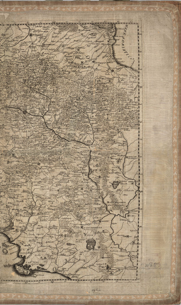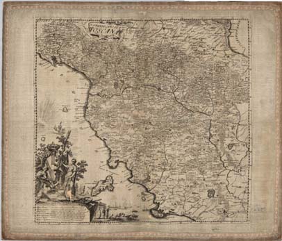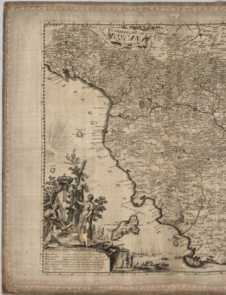 "Incisione su rame stampata su seta. Orientazione normale. Longitudine derivate dal meridiano dell´Isola del Ferro. Orografia prospettica a monticelli. Abitati principali rappresentati schematicamente in pianta: gli altri con torri e case. Confini e territori statali a colori. Limiti: nord, Valli di Comacchio est, Perugia ovest, Mare Mediterraneo sud, Sutri. Sette scale grafiche in misure antiche italiane ed estere. La stessa carta, stampata su foglio unico con confini e territori statali a colori, trovasi nella Coll. Bianconi n. 210. Allo stesso numero d'inventario esiste una copia stampata su carta."