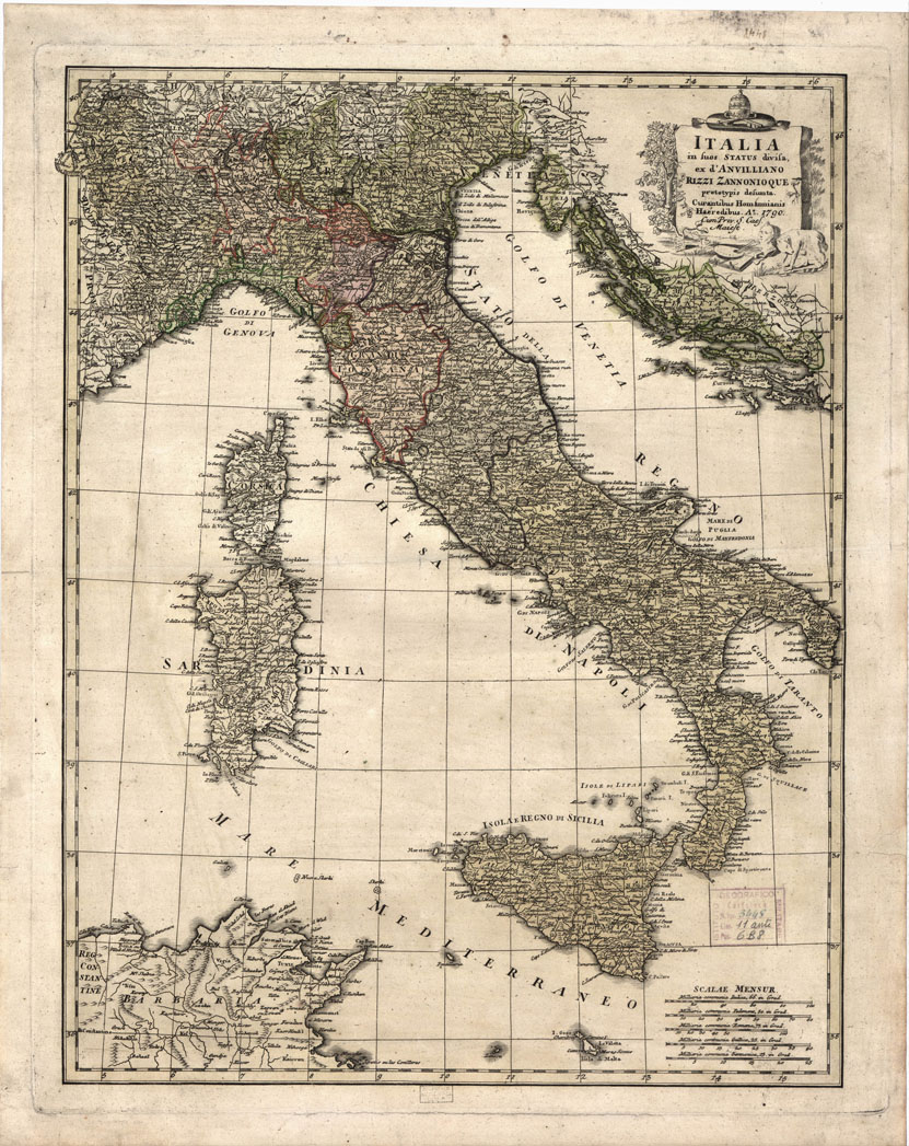 "Italia desunta dalle carte del D'Anville e di Rizzi Zannoni, edita dagli eredi Homann. Longitudini riferite al meridiano di Parigi. Orografia prospettica appena accennata. Toponomastica in italiano assai confusa per la sovrabbondanza di nomi. Territori statali e confini politici a colori. Cinque scale grafiche in miglia italiane, piemontesi, romane, francesi, tedesche."