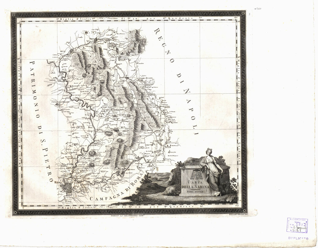 "Duplicato del gruppo di 12 carte pubblicate tra il 1802 e il 1821 alla Calcografia Camerale, Roma, alla scala di 1:246.760. Incisione di Bernardino Olivieri. E' tracciato il reticolato geografico con maglie rispondenti a 10' di latitudine per 10 ' di longitudine. Orografia a monticelli con tratteggio a luce obliqua. Abitati rappresentati in pianta. Sono tracciate le strade e i confini. Stampa in nero. Le 12 carte che compongono questo documento: Carta della Campagna di Roma - - Cfr. duplicato al File B0012955 Carta del Patrimonio di San Pietro - File B0002706 - Cfr. duplicato al File B0012958 Carta della Sabina - File B0002779 - Cfr. duplicatoal File B0012956 Carta del Territorio di Orvieto e Territorio di Perugia - File B0005503 - Cfr. duplicato al File B0012957 Carta della Marca di Fermo - File B0003960 - Cfr. duplicatoal File B0012961 Carta della Provincia dell'Umbria - File B0005509 - Cfr. duplicato al File B0012962 Carta del Ducato di Urbino - File B0005504 - Cfr. duplicato al File B0012959 Carta della Marca di Ancona - File B0003965 - Cfr. duplicato al File B0012960 Legazione di Ravenna divisa ne' suoi Governi - File B0002414 La Legazione di Forlì diviso ne' suoi Governi - File B0002413 Legazione di Bologna divisa ne' suoi Governi - File B0002412 Legazione Apostolica di Ferrara divisa ne' suoi Governi - File B0002411"