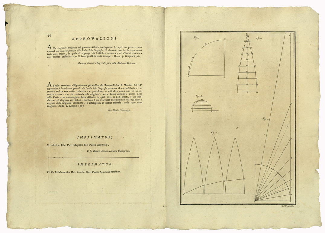 "...NELL'IMPERO DELLA RUSSIA IN EUROPA DELINEATI SULLE ULTIME OSSERVAZIONI. ROMA PRESSO LA CALCOGRAFIA CAMERALE 1796. "NUOVO ATLANTE GEOGRAFICO UNIVERSALE IN TRE TOMI", pubblicato in Roma presso la Calcografia Camerale, opera diretta per l'incisione da Padre G. M. Cassini. Il tomo I è dell'anno 1792, consta di carte 55 precedute da bella allegoria ideata da Tofanelli, incisa da Alessandro Mochetti. Il tomo II è dell'anno 1797, consta di carte 70, precedute da altra allegoria ideata e incisa da Demetrio Dragon. Il tomo III è dell'anno 1801, consta di 57 carte precedute da allegoria di Demetrio Dragon (come nel tomo II). L'opera grandiosa è stata favorita da Papa Pio VI. Redattore, specialmente del tomo I, è il Canonico D. Pietro Bonaccorsi. Del documento fanno parte un testo ed i globi. Testo: "INTRODUZIONE GENERALE ALLO STUDIO DELLA GEOGRAFIA" compendiosa notizia di pagine 34 stampata a Roma nella Calcografia Camerale, divisa in cinque parti: (1792-1801). Parte 1) della Sfera e de' due Globi celeste e terrestre. Parte 2) de' termini generali della Geografia. Parte 3) dell'origine, progressi e stato attuale della medesima. Parte 4) del metodo tenuto per il presente Atlante. Parte 5) delle navigazioni degli antichi fino a noi, e delle scoperte onde per loro mezzo si è arricchita la geografia. Di quest'opera si posseggono due copie, una è mancante del titolo. "GLOBI DELINEATI DAL PADRE GIOVANNI MARIA CASSINI CHIERICO REGOLARE SOMASCO", costruiti per la Biblioteca dell' I.G.M. nell'anno 1928. Il materiale per formare i Globi è stato tracciato dal Cassini, che fu geografo, cartografo e intagliatore su rame. Al numero d'ordine 44 del catalogo è la descrizione del Testo: "INTRODUZIONE GENERALE ALLO STUDIO DELLA GEOGRAFIA" e del "NUOVO ATLANTE GEOGRAFICO UNIVERSALE IN TRE TOMI", editi fra gli anni 1792-1801, contenenti complessivamente 182 tavole artisticamente incise. Le tavole 7, 8, 9, 10, 15 e 17 del tomo I contengono i disegni per formare il GLOBO TERRESTRE. A costruire il GLOBO CELESTE sono servite le tavole 11, 12, 13, 14, 16 e 18 dello stesso tomo I. La periferia dei 12 spicchi è metri 1,06 in ambi i disegni altre caratteristiche comuni alle due sfere sono: linea equatoriale, tropici, eclittica, ampiezza degli spicchi all'equatore 30°. Il Globo terrestre è del 1843, ma prima di tale data esso subì delle varianti, concretate dopo accrescimenti per nuove scoperte geografiche e conseguenti rettifiche, nella attuale rappresentazione. I meridiani sono tracciati, come i paralleli, ogni 10°. Il meridiano iniziale, che passa per l'Isola del Ferro, l'equatore e l'eclittica, sono divisi in gradi. Il sostegno, o castello, è in legno tornito a quattro colonnine presenta sull'orizzonte incollata una carta colle indicazioni dei segni dello zodiaco, delle rose dei venti, e con la divisione di grado in grado. Una tabellina offre la lunghezza del grado del circolo massimo della Sfera terrestre in 14 diverse unità di misura. Il Globo celeste contiene le costellazioni, la via lattea, le stelle fino alla 6^ grandezza e le nebulose è calcolato per l'anno 1792 sui dati degli astronomi "Flamsteed e De la Caille". E' rivestito con spicchi come il Globo terrestre. Le due Sfere ruotano attorno un asse di acciaio che passa per i poli i sostegni sono eguali nei due Globi."