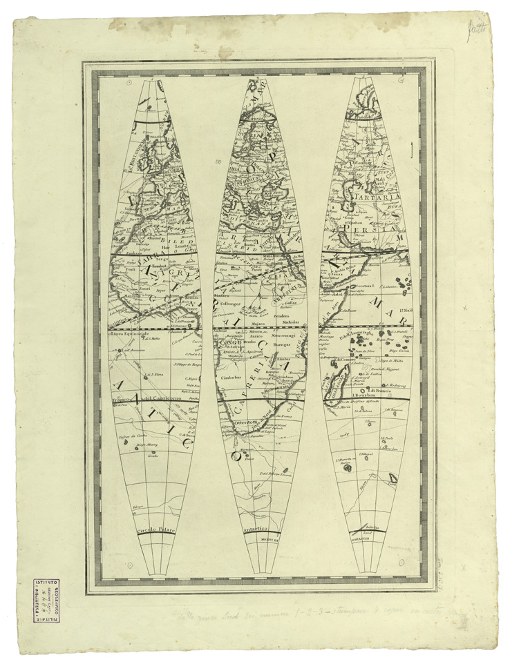 "...NUOVAMENTE DELINEATO RETTIFICATO ED ACCRESCIUTO GIUSTA LE PIU' RECENTI SCOPERTE ROMA PRESSO LA CALCOGRAFIA CAMERALE, 1843. "GLOBI DELINEATI DAL PADRE GIOVANNI MARIA CASSINI CHIERICO REGOLARE SOMASCO" costruiti per la Biblioteca dell' I.G.M. nell'anno 1928. Il materiale per formare i Globi è stato tracciato dal Cassini, che fu geografo, cartografo e intagliatore su rame. Al numero d'ordine 44 del catalogo è la descrizione del Testo: "INTRODUZIONE GENERALE ALLO STUDIO DELLA GEOGRAFIA" e del "NUOVO ATLANTE GEOGRAFICO UNIVERSALE IN TRE TOMI", editi fra gli anni 1792-1801, contenenti complessivamente 182 tavole artisticamente incise. Le tavole 7, 8, 9, 10, 15 e 17 del tomo I contengono i disegni per formare il GLOBO TERRESTRE. A costruire il GLOBO CELESTE sono servite le tavole 11, 12, 13, 14, 16 e 18 dello stesso tomo I. La periferia dei 12 spicchi è metri 1,06 in ambi i disegni altre caratteristiche comuni alle due sfere sono: linea equatoriale, tropici, eclittica, ampiezza degli spicchi all'equatore 30°. Il Globo terrestre è del 1843, ma prima di tale data esso subì delle varianti, concretate dopo accrescimenti per nuove scoperte geografiche e conseguenti rettifiche, nella attuale rappresentazione. I meridiani sono tracciati, come i paralleli, ogni 10°. Il meridiano iniziale, che passa per l'Isola del Ferro, l'equatore e l'eclittica, sono divisi in gradi. Il sostegno, o castello, è in legno tornito a quattro colonnine presenta sull'orizzonte incollata una carta colle indicazioni dei segni dello zodiaco, delle rose dei venti, e con la divisione di grado in grado. Una tabellina offre la lunghezza del grado del circolo massimo della Sfera terrestre in 14 diverse unità di misura. Il Globo celeste contiene le costellazioni, la via lattea, le stelle fino alla 6^ grandezza e le nebulose è calcolato per l'anno 1792 sui dati degli astronomi "Flamsteed e De la Caille". E' rivestito con spicchi come il Globo terrestre. Le due Sfere ruotano attorno un asse di acciaio che passa per i poli i sostegni sono eguali nei due Globi. "NUOVO ATLANTE GEOGRAFICO UNIVERSALE IN TRE TOMI", pubblicato in Roma presso la Calcografia Camerale, opera diretta per l'incisione da Padre G. M. Cassini. Il tomo I è dell'anno 1792, consta di carte 55 precedute da bella allegoria ideata da Tofanelli, incisa da Alessandro Mochetti. Il tomo II è dell'anno 1797, consta di carte 70, precedute da altra allegoria ideata e incisa da Demetrio Dragon. Il tomo III è dell'anno 1801, consta di 57 carte precedute da allegoria di Demetrio Dragon (come nel tomo II). L'opera grandiosa è stata favorita da Papa Pio VI. Redattore, specialmente del tomo I, è il Canonico D. Pietro Bonaccorsi. Del documento fanno parte un testo ed i globi. Testo: "INTRODUZIONE GENERALE ALLO STUDIO DELLA GEOGRAFIA" compendiosa notizia di pagine 34 stampata a Roma nella Calcografia Camerale, divisa in cinque parti: (1792-1801). Parte 1) della Sfera e de' due Globi celeste e terrestre. Parte 2) de' termini generali della Geografia. Parte 3) dell'origine, progressi e stato attuale della medesima. Parte 4) del metodo tenuto per il presente Atlante. Parte 5) delle navigazioni degli antichi fino a noi, e delle scoperte onde per loro mezzo si è arricchita la geografia. Di quest'opera si posseggono due copie, una è mancante del titolo."