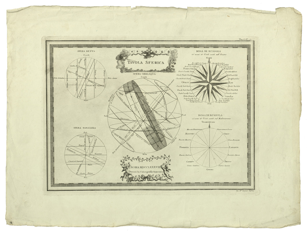 "...ROMA MDCCL"VIII PRESSO LA CALCOGRAFIA CAMERALE. "GLOBI DELINEATI DAL PADRE GIOVANNI MARIA CASSINI CHIERICO REGOLARE SOMASCO" costruiti per la Biblioteca dell' I.G.M. nell'anno 1928. Il materiale per formare i Globi è stato tracciato dal Cassini, che fu geografo, cartografo e intagliatore su rame. Al numero d'ordine 44 del catalogo è la descrizione del Testo: "INTRODUZIONE GENERALE ALLO STUDIO DELLA GEOGRAFIA" e del "NUOVO ATLANTE GEOGRAFICO UNIVERSALE IN TRE TOMI", editi fra gli anni 1792-1801, contenenti complessivamente 182 tavole artisticamente incise. Le tavole 7, 8, 9, 10, 15 e 17 del tomo I contengono i disegni per formare il GLOBO TERRESTRE. A costruire il GLOBO CELESTE sono servite le tavole 11, 12, 13, 14, 16 e 18 dello stesso tomo I. La periferia dei 12 spicchi è metri 1,06 in ambi i disegni altre caratteristiche comuni alle due sfere sono: linea equatoriale, tropici, eclittica, ampiezza degli spicchi all'equatore 30°. Il Globo terrestre è del 1843, ma prima di tale data esso subì delle varianti, concretate dopo accrescimenti per nuove scoperte geografiche e conseguenti rettifiche, nella attuale rappresentazione. I meridiani sono tracciati, come i paralleli, ogni 10°. Il meridiano iniziale, che passa per l'Isola del Ferro, l'equatore e l'eclittica, sono divisi in gradi. Il sostegno, o castello, è in legno tornito a quattro colonnine presenta sull'orizzonte incollata una carta colle indicazioni dei segni dello zodiaco, delle rose dei venti, e con la divisione di grado in grado. Una tabellina offre la lunghezza del grado del circolo massimo della Sfera terrestre in 14 diverse unità di misura. Il Globo celeste contiene le costellazioni, la via lattea, le stelle fino alla 6^ grandezza e le nebulose è calcolato per l'anno 1792 sui dati degli astronomi "Flamsteed e De la Caille". E' rivestito con spicchi come il Globo terrestre. Le due Sfere ruotano attorno un asse di acciaio che passa per i poli i sostegni sono eguali nei due Globi. Del documento fanno parte un atlante ed un testo. "NUOVO ATLANTE GEOGRAFICO UNIVERSALE IN TRE TOMI", pubblicato in Roma presso la Calcografia Camerale, opera diretta per l'incisione da Padre G. M. Cassini. Il tomo I è dell'anno 1792, consta di carte 55 precedute da bella allegoria ideata da Tofanelli, incisa da Alessandro Mochetti. Il tomo II è dell'anno 1797, consta di carte 70, precedute da altra allegoria ideata e incisa da Demetrio Dragon. Il tomo III è dell'anno 1801, consta di 57 carte precedute da allegoria di Demetrio Dragon (come nel tomo II). L'opera grandiosa è stata favorita da Papa Pio VI. Redattore, specialmente del tomo I, è il Canonico D. Pietro Bonaccorsi. Del documento fanno parte un testo ed i globi. Testo: "INTRODUZIONE GENERALE ALLO STUDIO DELLA GEOGRAFIA" compendiosa notizia di pagine 34 stampata a Roma nella Calcografia Camerale, divisa in cinque parti: (1792-1801). Parte 1) della Sfera e de' due Globi celeste e terrestre. Parte 2) de' termini generali della Geografia. Parte 3) dell'origine, progressi e stato attuale della medesima. Parte 4) del metodo tenuto per il presente Atlante. Parte 5) delle navigazioni degli antichi fino a noi, e delle scoperte onde per loro mezzo si è arricchita la geografia. Di quest'opera si posseggono due copie, una è mancante del titolo."